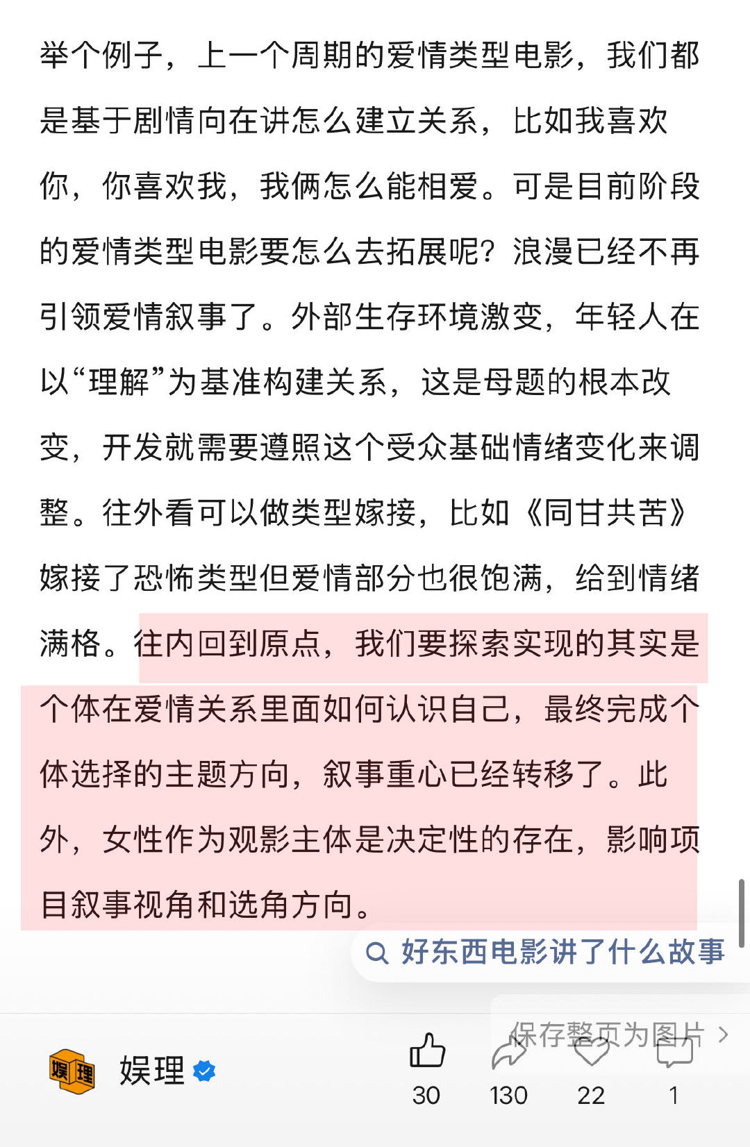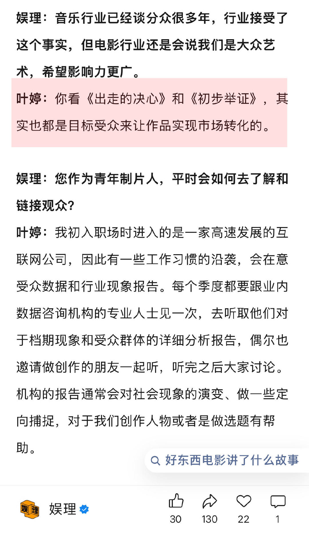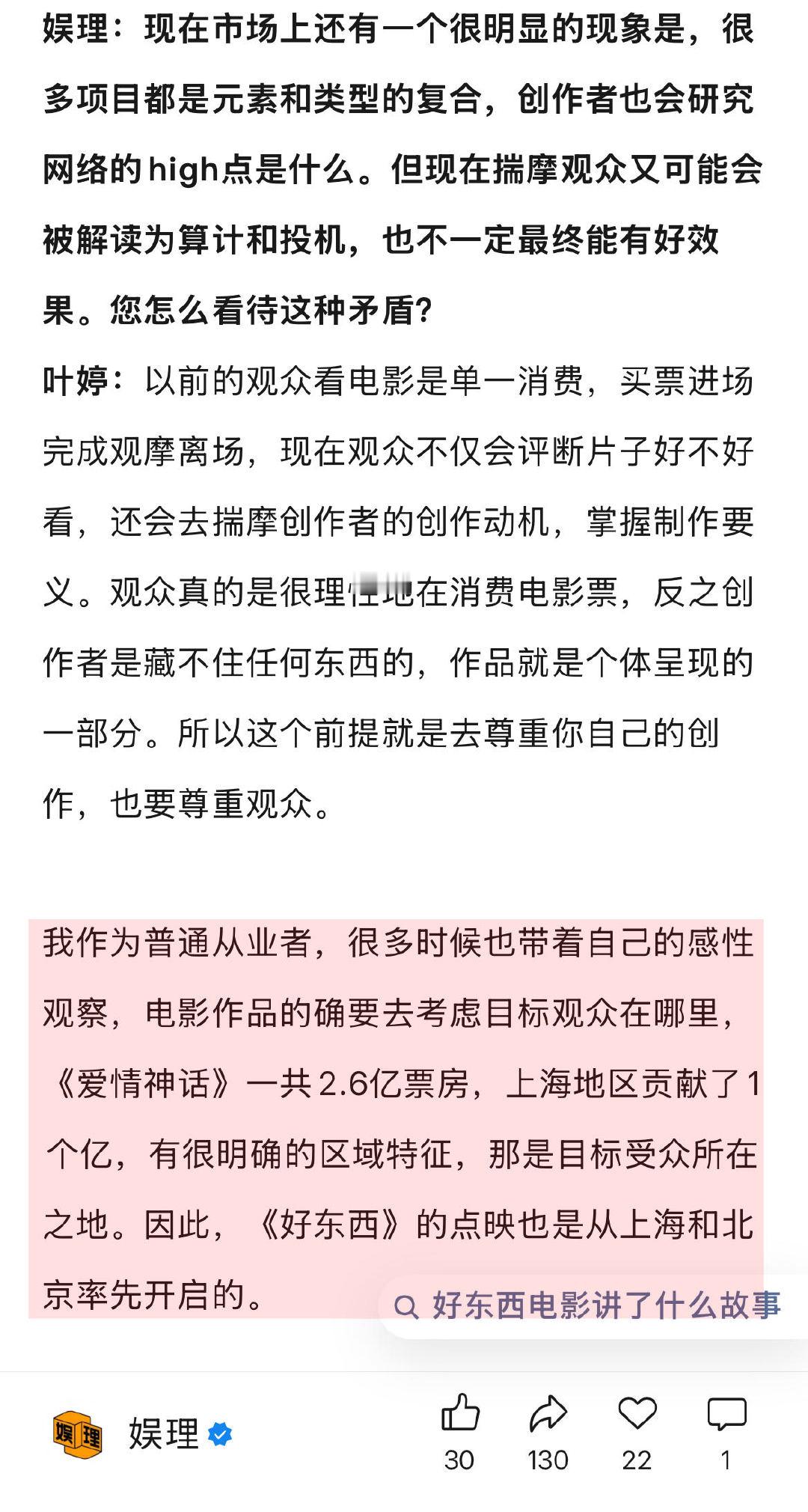 谈及电影项目的符合趋势及观众反馈之间的矛盾,《好东西》制片人叶婷直言观众是在很理性地消费电影票,“我作为普通从业者,很多时候也带着自己的感性观察,电影作品的确要去考虑目标观众在哪里,《爱情神话》一共2.6亿票房,上海地区贡献了1个亿,有很明确的区域特征,那是目标受众所在之地。因此,《好东西》的点映也是从上海和北京率先开启的…”↓