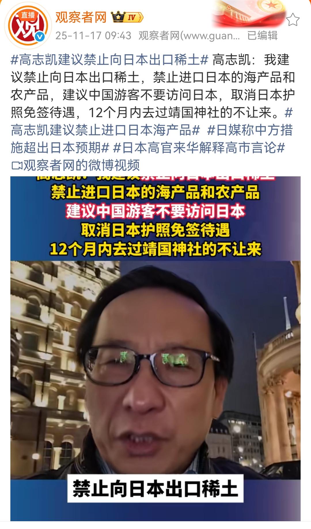 高志凯:我建议禁止向日本出口稀土,禁止进口日本的海产品和农产品,建议中国游客不要访问日本,取消日本护照免签待遇,12个月内去过靖国神社的不让来! 高志凯教授果然一针见血,指出来我们现在所有可以采取的措施,而且这些措施对于我们来说没有任何的影响,充分的保护了我们的利益。 同时我们也要加大对日本企业的吸引力度,保护日本企业在华的财产一切为我所用,也要欢迎所有来中国旅游的日本善意的游客。各位是怎么看的?欢迎评论区留言。