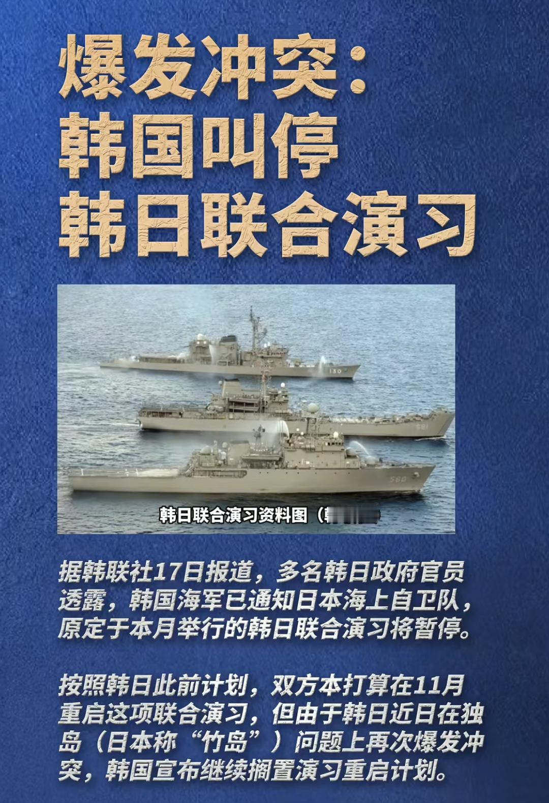 韩国叫停韩日联合演习! 11月17日新华社消息,韩国海军方面已经通知日本海上自卫队原定于本月举行的韩日联合演习被暂停。 韩国也和日本就独岛归属再次爆发冲突,本来日本在冲绳要给韩国赴迪拜飞行表演队进行加油,但是日本以飞行表演队的部分黑鹰直升机曾在独岛上空活动,拒绝为韩方提供加油服务,导致韩国飞行表演队无法飞赴迪拜,双方矛盾又再一次加深。 各位是怎么看的?欢迎评论区留言。