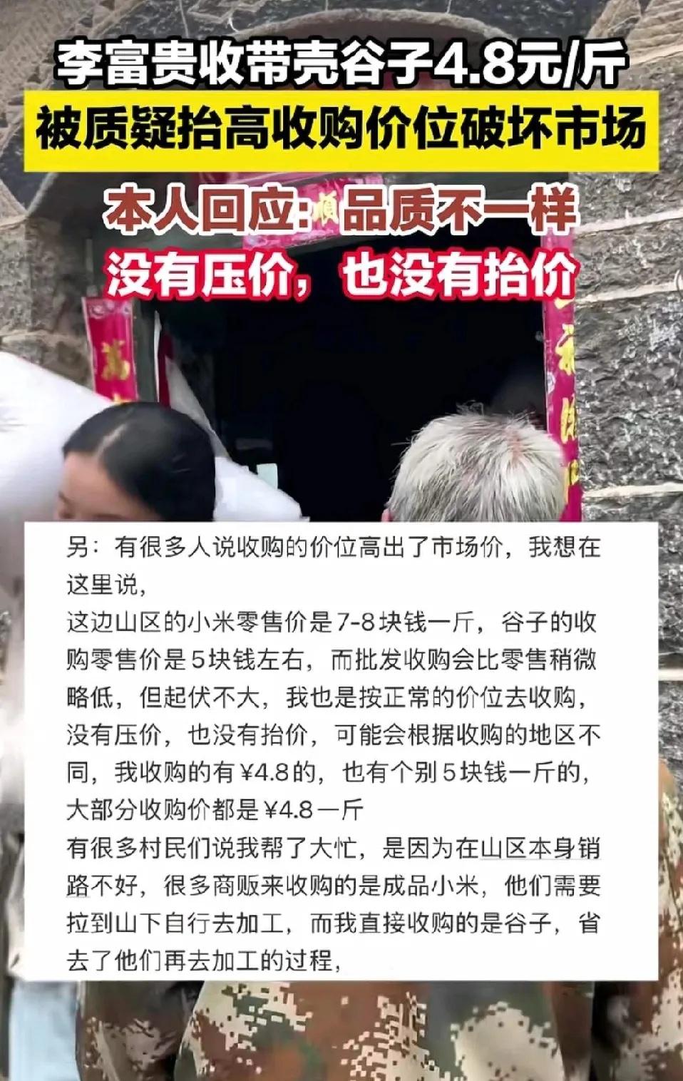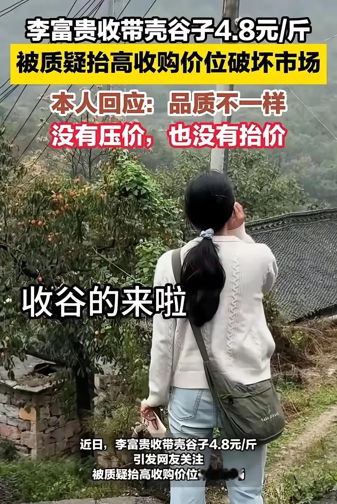 当年董宇辉说谷贱伤农,现在李富贵挨家挨户收带壳谷子4.8一斤。要知道现在超市的大米才2块多一斤啊,莫非李富贵这账算糊涂了? 只见她在直播间掰着手指把账算得明明白白:谷子成本4.8,加上运回来成本4.9,脱壳加工每斤6毛,包装和物流加一起1.5元,一斤的成本就到了7块。在直播间上车价格是7.8元一斤,每斤只赚8毛钱,现场的场地费、水电等成本,再加人工、报税等,其实也赚不了多少钱。 但是,李富贵就想把大山里的好物带给网友,也把山里大爷大娘里的山货变成钱。 这中间的周转只通过李富贵,没有别的总经销、分销商。 要知道,每经过一层分销就会再加一道码,农民卖东西的成本门槛越来越高,网友买到正宗山货的价格也会越来越高。 李富贵只要进山,就会将手握成喇叭状,大喊:收谷的来了。 她没用大喇叭,一切都是最原始的最简单的,反而得到了村民们的喜欢。 人们愿意将好的山货卖给她,她也尽心尽力地为村民们解决后顾之忧。 只要有好的农产品,她就能在直播间开卖,网友们冲着李富贵就会下单。 这一切形成了一个良性循环,收货、卖货,这一收一卖,将村民们的心越拉越近,也增强了李富贵粉丝的粘性,李富贵的网红事业越做越红火。 一切都是最好的安排,最美好的样子,一切刚刚好。 所以说,像董宇辉和李富贵这样的年轻人,即使他们已经富裕了,但他们是农村孩子的本色并没有褪色。 他们知道来时路的不易,觉得反是是必须要做的,而且也是必须要做好的。