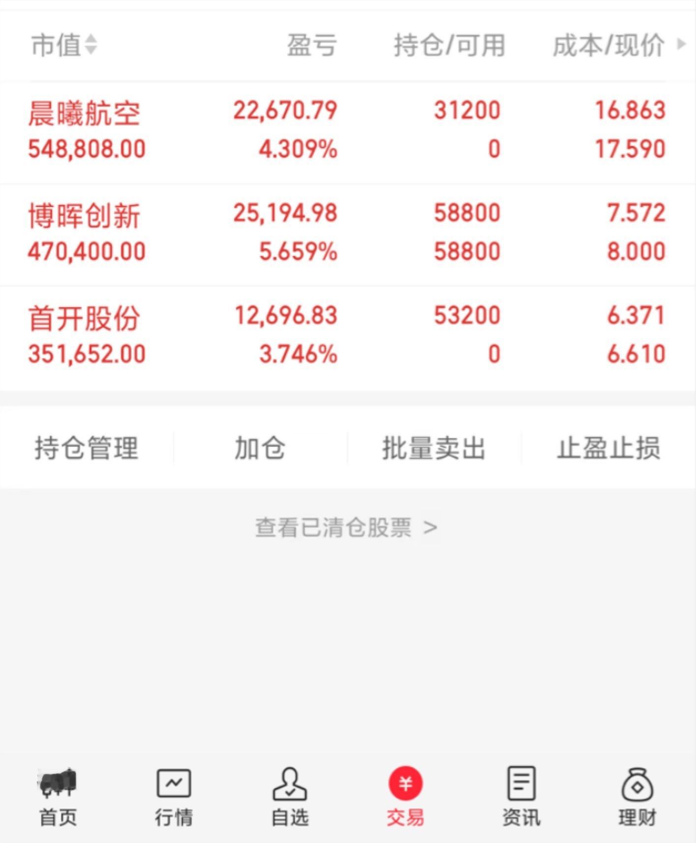 今天买入:首开股份、晨曦航空继续持有:博晖创新还是期待有肉吃… 喜欢短线来一起特别声明:这只是我个人的操作记录,不作为任何投资建议,更不是劝 你们有跟买是! 股市有风险,投资需谨慎!