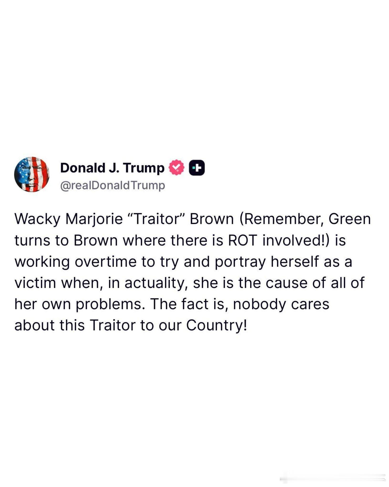 【黄金时代】川普劝马娇蕊别演了,别再装受害人了川普:怪胎玛乔丽“叛徒”布朗(记住,“Green”变成“Brown”,那说明里面有腐烂!)正在拼命加班,把自己装成受害者,但事实上,她所有的问题都是自己造成的。事实是,没有人关心这个背叛国家的人!注,马娇蕊本叫格林,也就是英语绿色Green的意思,川普给她改名叫布朗Brown棕色,然后说,Green变成Brown因为腐烂