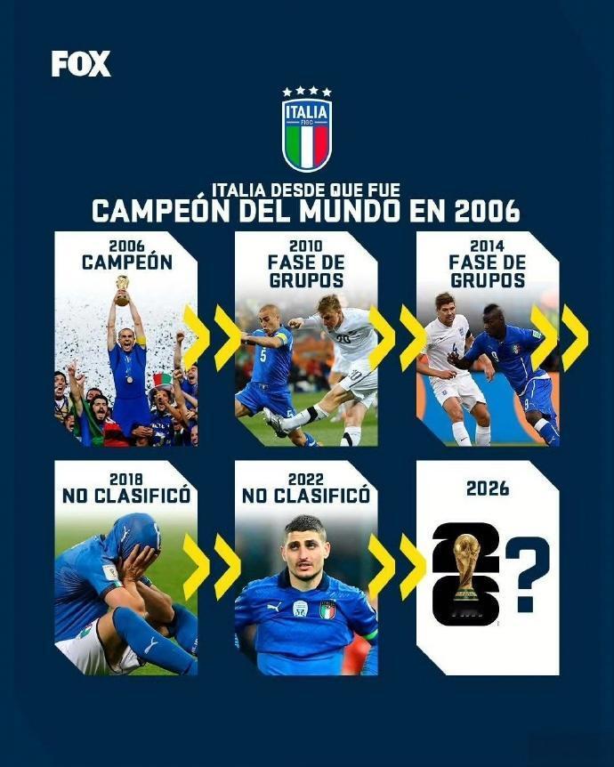 意大利巅峰2006年之后,已经越来越差。 2010年世界杯,意大利就2分垫底..... 2014年世界杯,意大利3分小组第三.... 2018年,2022年都没有进世界杯正赛。 现在全世界都在等他们连续三次嗝屁,感觉注定悲情的球队呀。[可怜]