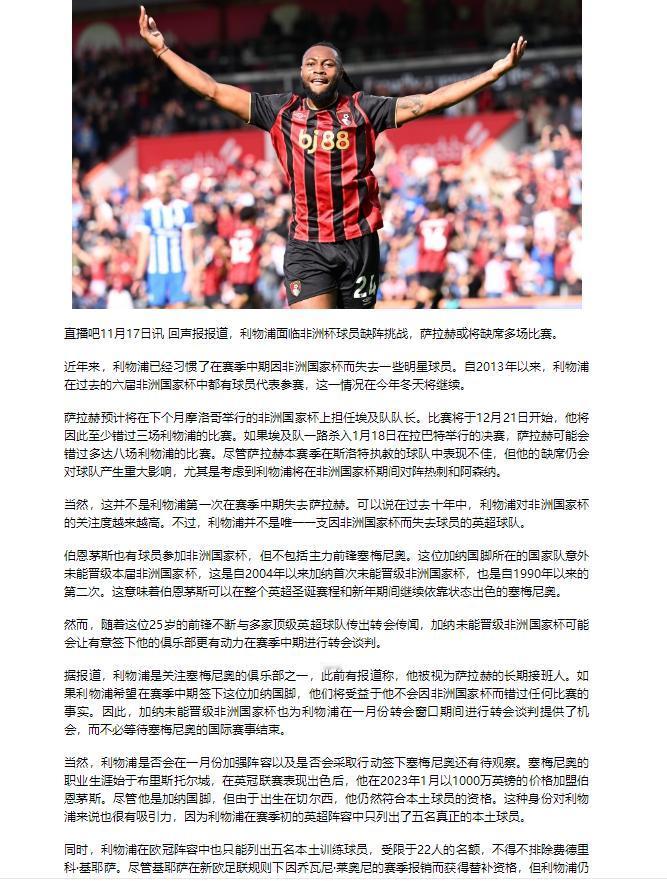 萨拉赫去踢非洲杯,利物浦就签赛门约! 本赛季在伯恩茅斯,塞门亚打进6球3助攻,作为25岁边锋还不错。 利物浦正在找办法,如果萨拉赫回来还不发挥,估计以后很难踢主力了。 赛门约冬天不来,明年夏天也有希望加盟利物浦。[得意]