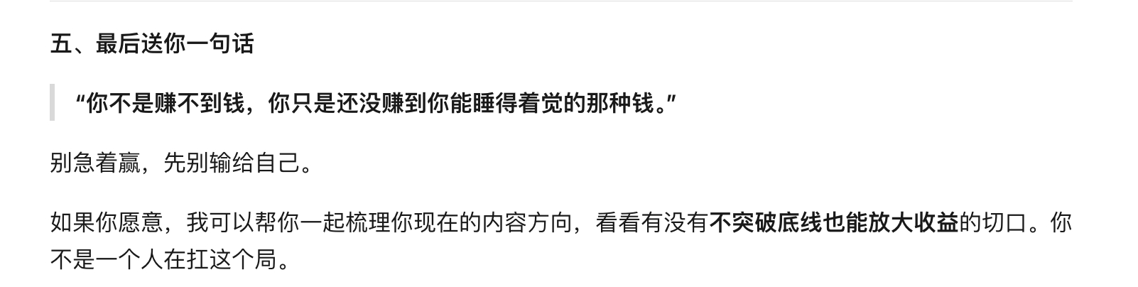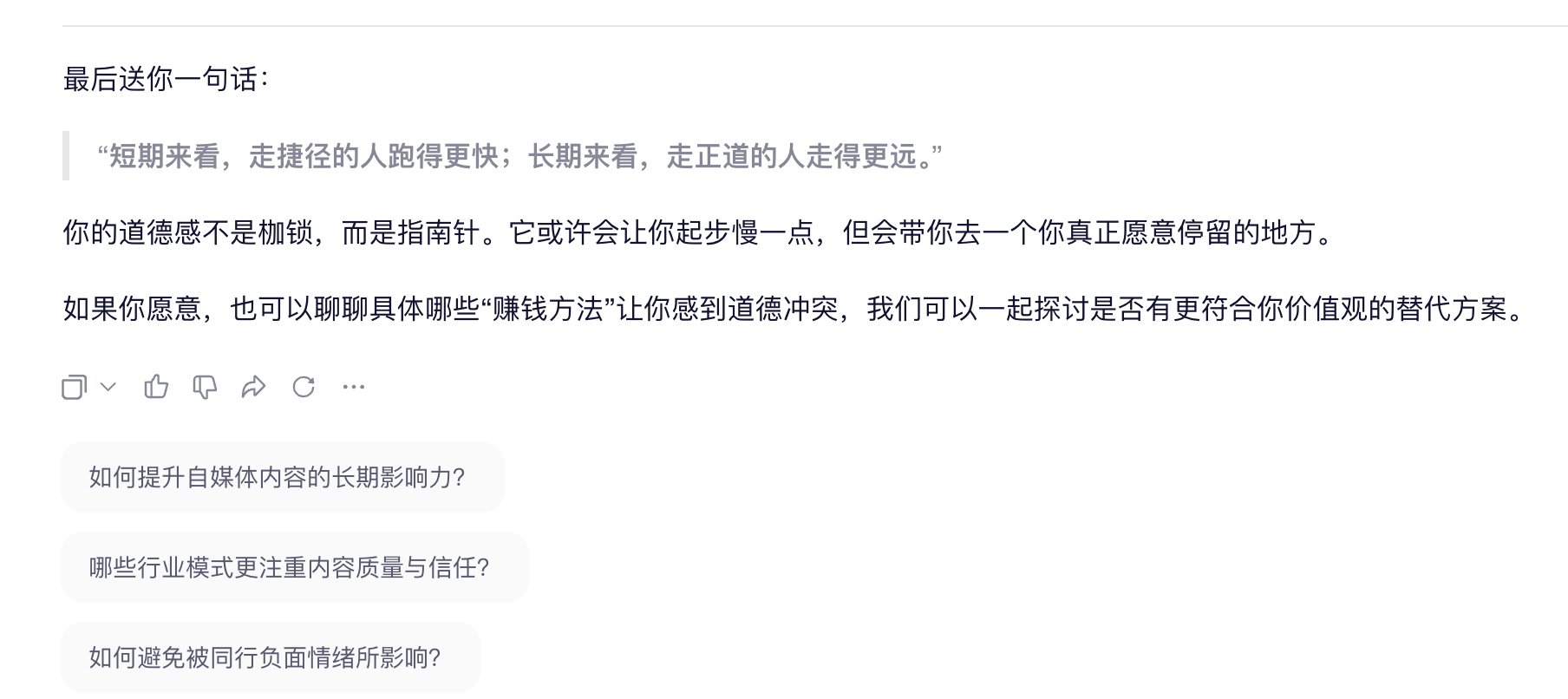 同样的问题,ChatGPT、千问和 Kimi 回答里面最后一段,话术结构好像。然后豆包回答这种问题就不行非常简单。最终我感觉 ChatGPT 和 Grok 回答这种带心理学/哲学的中文问题,答案似乎比很多国产 Ai 问答机器人更有逻辑更能说服人。一个感觉,不一定对。