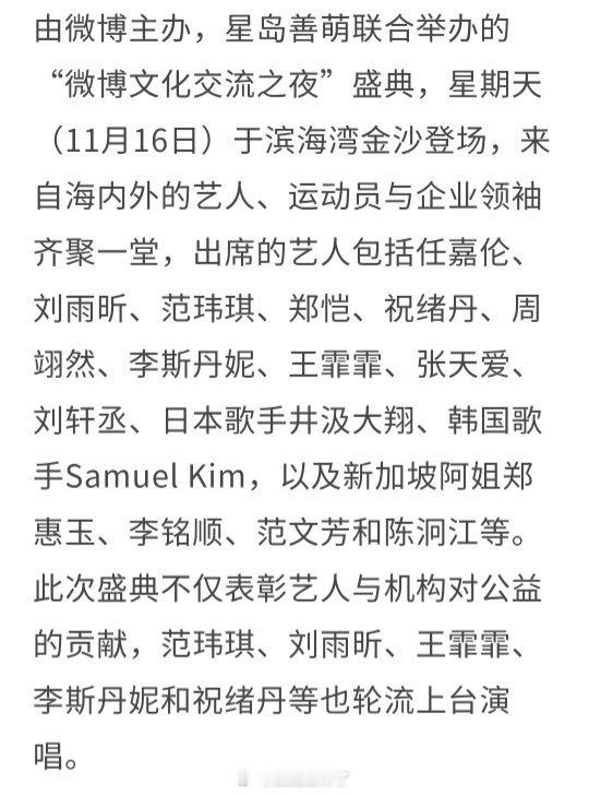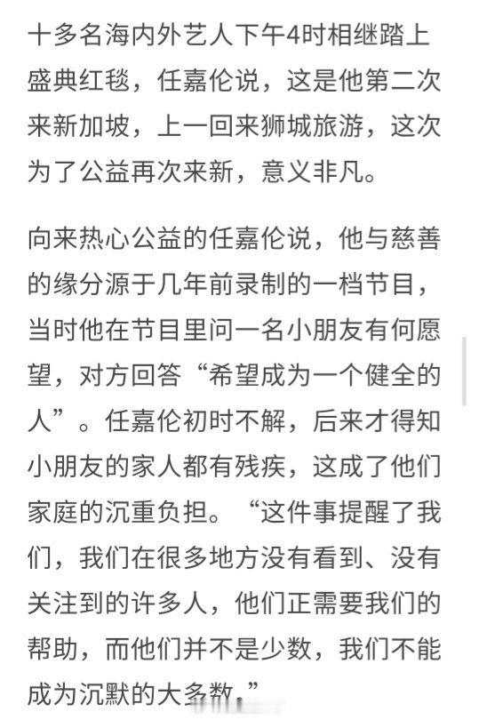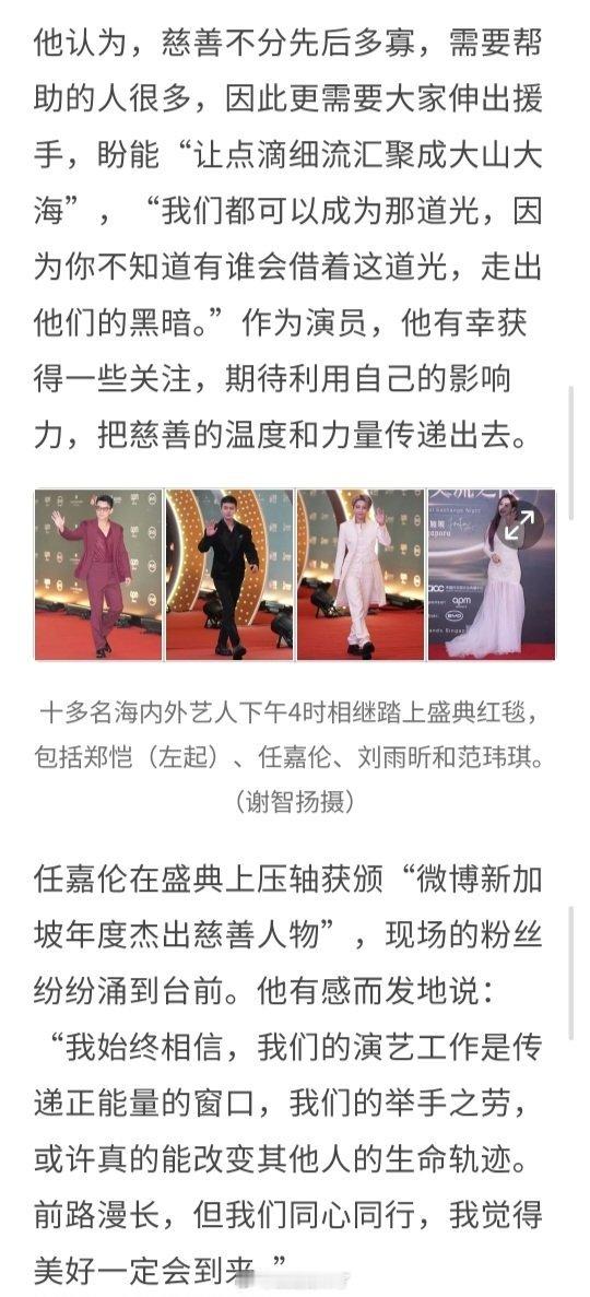 新加坡权威华文媒体联合早报11月17日报道:众星齐聚狮子城,任嘉伦谈慈善:点滴细流汇成大山大海。任嘉伦在盛典上压轴获颁“微博新加坡年度杰出慈善人物”。