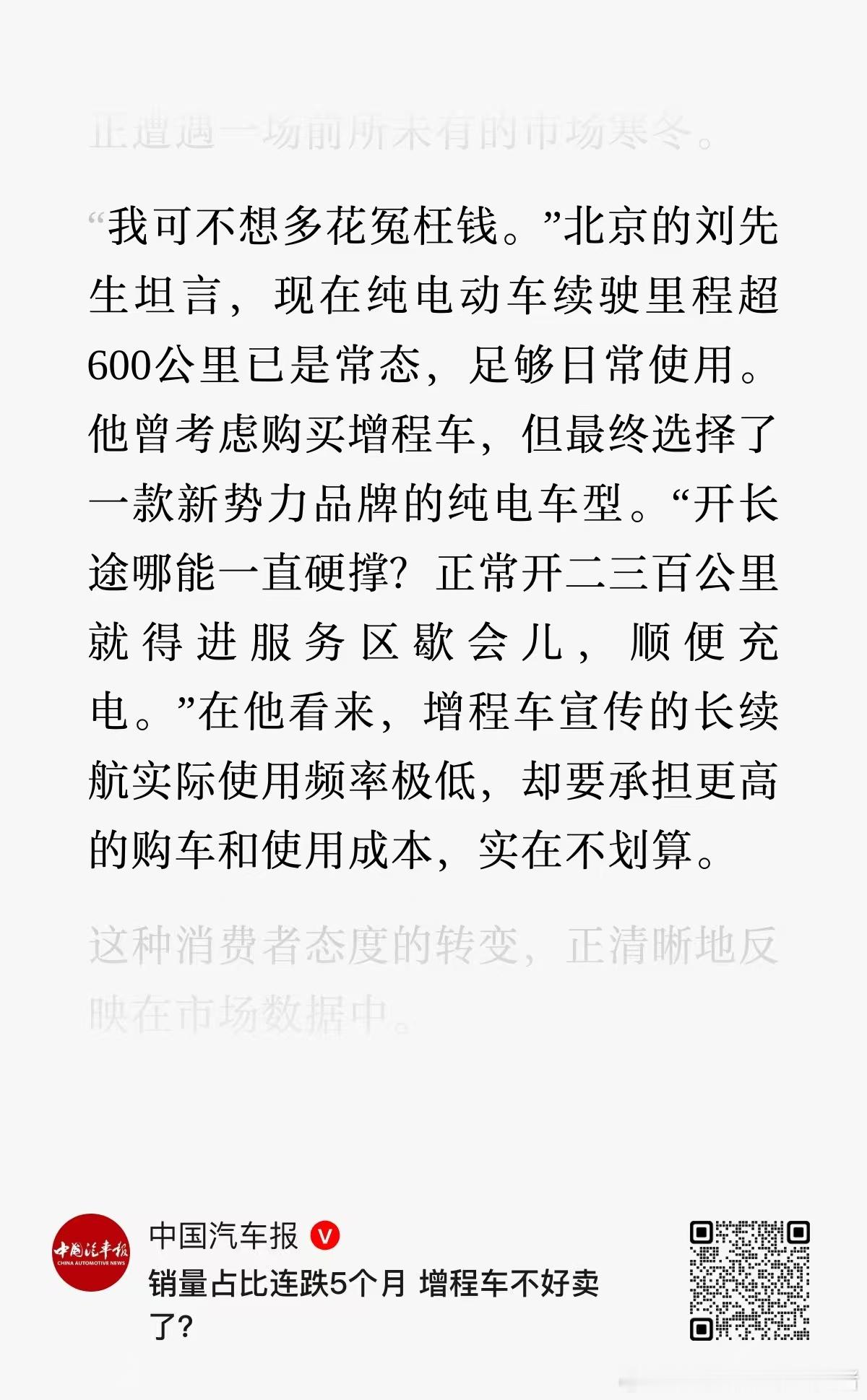 越来越多的人的认知,越来越清醒,终于不再被那些所谓的“焦虑”洗脑。增程器每年的保养成本其实也不低的你不用,不代表不需要保养一步到位,买纯电是明智选择