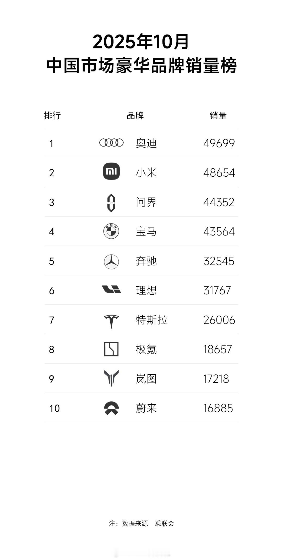 10月豪华品牌销量榜,奥迪第一,小米第二(国产第一),问界第3,前三里面,已经有两个国产品牌。另外一个变化,Top10的门槛变高,之前月销1万多就能进,现在已经到1.7万了,国产品牌销量增长很明显。