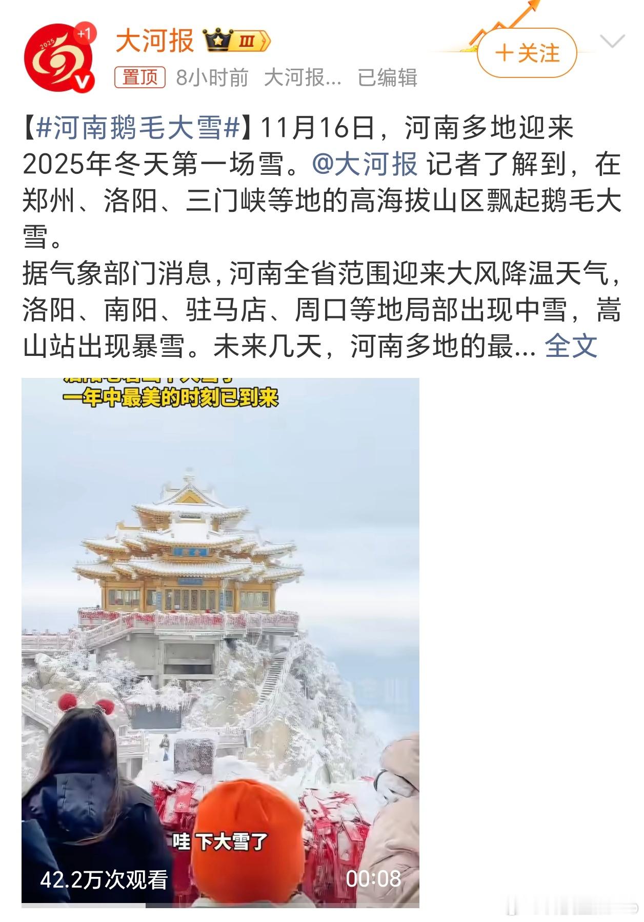 啊,河南已经下大雪了吗,山东这边气温已经降下来了,但是没有雪花,我还想等威海下大雪的时候去玩趟呢
