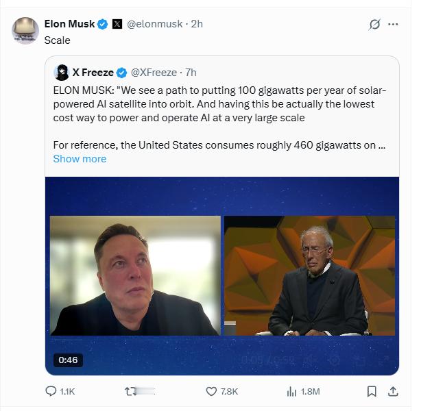 过去一年,大模型疯狂扩张,算力需求几乎是指数级增长。结果就是:电不够、冷却不够、数据中心建得比模型慢,整个行业卡在能源和基础设施上。马斯克说得更直接:建晶圆厂要五年,“对我来说五年等于永恒”。所以他有个最新太空算力规划:每年把 100 吉瓦太阳能驱动的 AI 卫星送上轨道,用太空太阳能给大规模 AI 供电,成本更低、扩容无上限。说白了,就是把算力从土地上解放出来。这也解释了为什么特斯拉、xAI、SpaceX都在加速自建算力,不想被台积电和三星的节奏卡脖子。