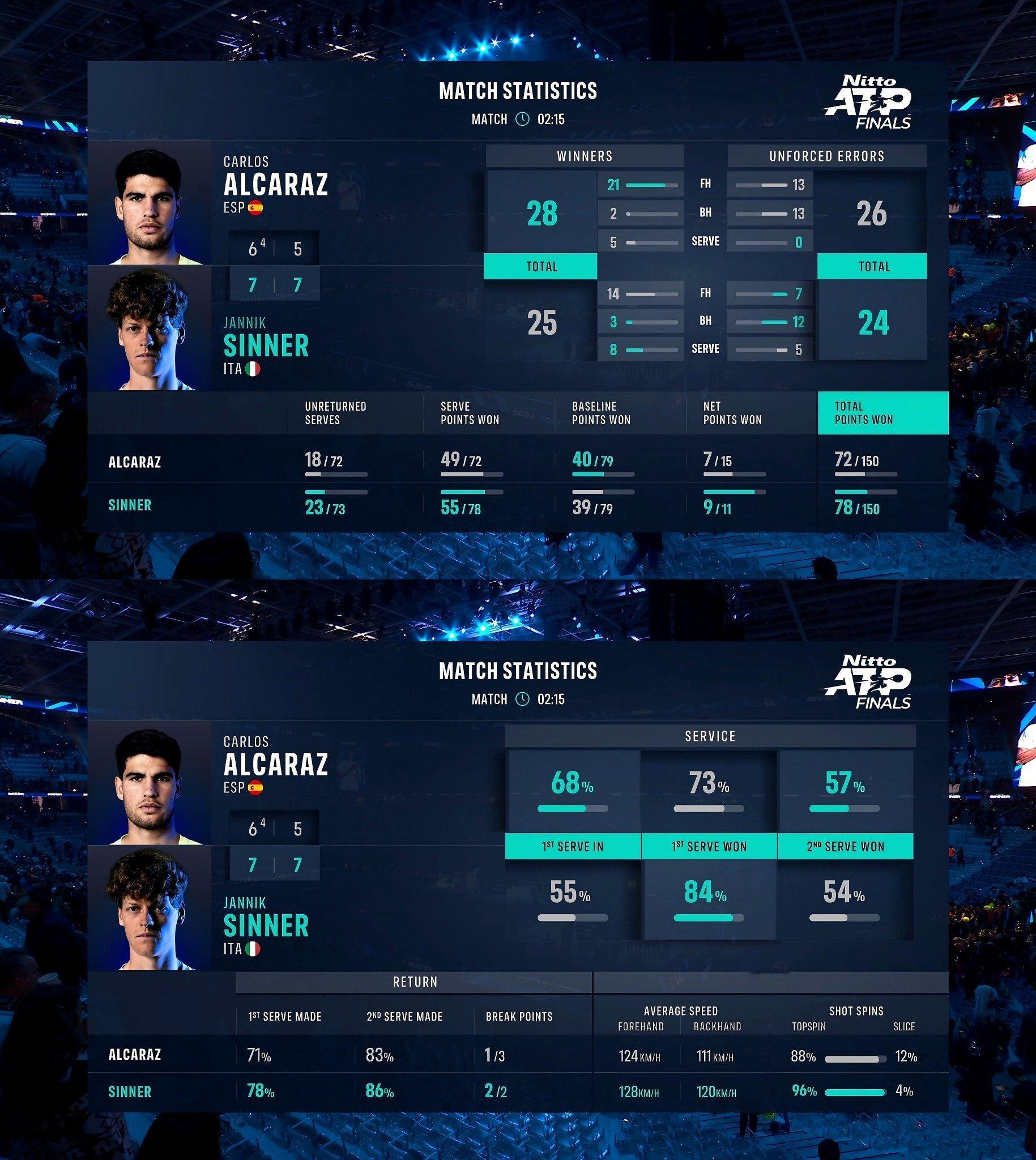【阿卡为何错失年终总决赛冠军?】今天凌晨的总决赛冠军赛前,阿卡10-5领先辛纳,可以说他是辛纳最怕的对手。具体原因如下:· 阿卡的极致防反· 阿卡提升状态的能力· 辛纳发球的不足1. 2025赛季,辛纳得分转化率巡回赛最高,达到74%(巡回赛平均值69%),然而,当他面对阿卡时,得分率却降至61%。阿卡独特的球场覆盖范围、击球技巧,以及从看似不可能的位置发起的偷分能力,导致了辛纳的得分率显著下降。2. 阿卡过去52周平均质量分:正手8.5,反手7.9。当他对阵辛纳时,正手得分上升到8.9,反手8.5。而这两项数据,辛纳的得分则朝着相反的方向发展。3. 辛纳的发球质量平均值为8.2。当他对阵阿卡时,下降到7.6,一发球质量下降了7%,球速下降了2英里/小时,而且发球的命中率也在下降。在都灵的冠军赛中,阿卡这三点都没能压制辛纳。制胜分只比辛纳多3分,UE多两个,得分转化率低了4%;辛纳正反手球速和上旋使用都强于阿卡,网前得分和上网次数双双领先;在一发进球率远低于本周平均值,只有55%的不利局面下,辛纳一发得分高达84%,全场只被阿卡破掉一局,发球得分率/发球直得均领先阿卡,接一发/二发成功率全部占优。美网决赛到现在也就两个月,辛纳进化的速度超出了预期。冬训期阿卡需要打磨自己的风格,明年辛纳大战最大的看点,就是谁能率先完成全满贯。