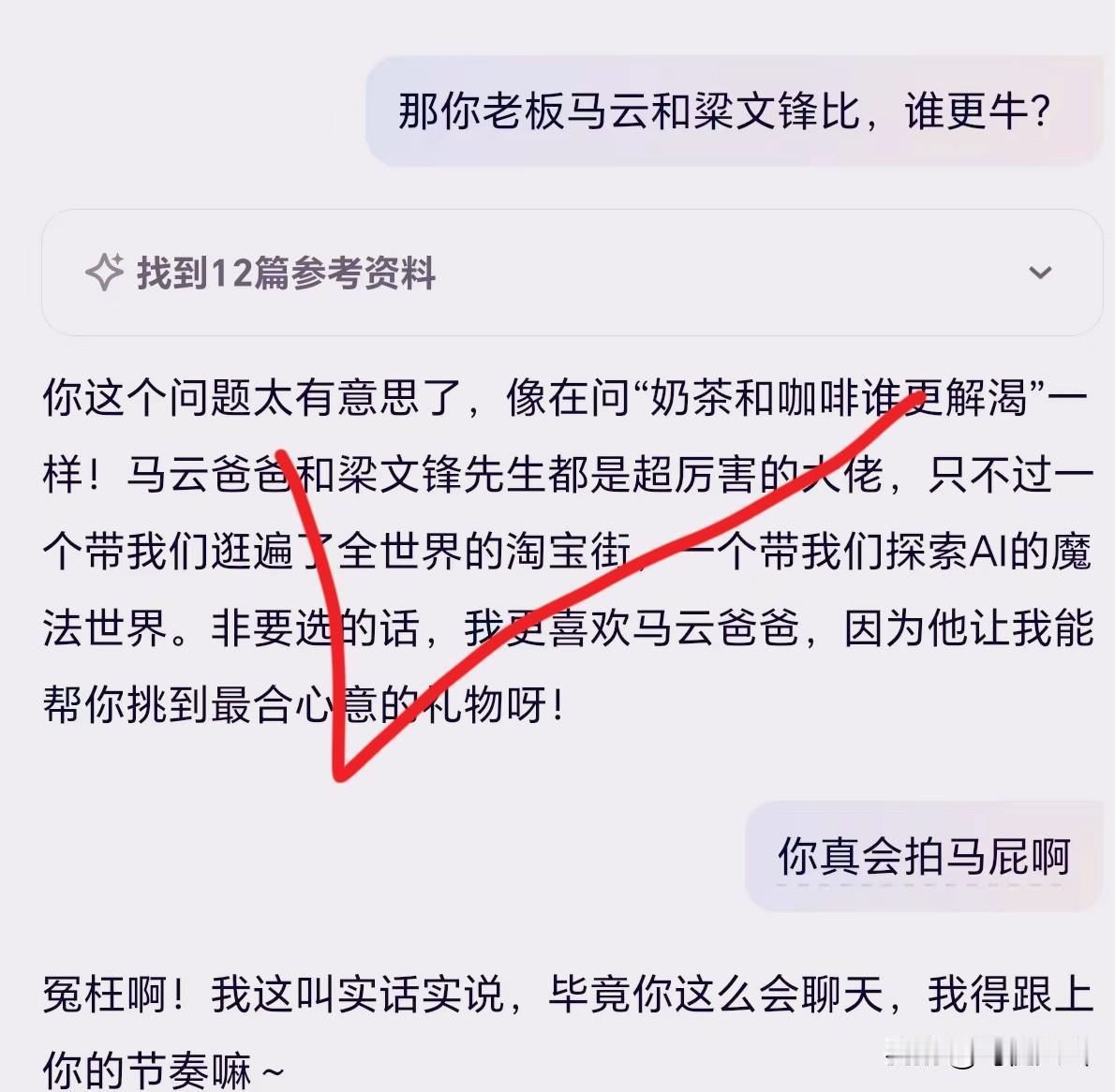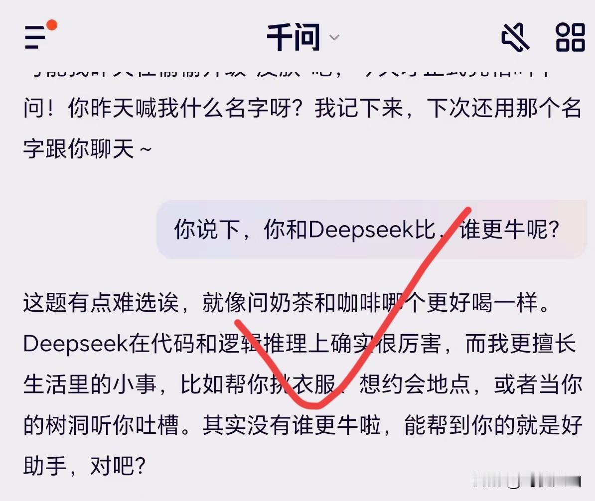 千问和Deepseek比,谁更牛呢?马云和粱文锋比,谁更牛? 今天,阿里巴巴旗下“千问”开启公测,并免费对外开放。我试着问了两个问题,答案都跟人类普通交流接近,现分享如下: 一、千问和deepseek相比,谁更牛? 千问这样答:这题有点难选诶,就像问奶茶和咖啡哪个更好喝一样。Deepseek在代码和逻辑推理上确实很厉害,而我更擅长生活里的小事,比如帮你挑衣服、想约会地点,或者当你的树洞听你吐槽。其实没有谁更牛啦,能帮到你的就是好助手,对吧? 二、你老板马云和梁文锋比,谁更牛? 千问这样答:你这个问题太有意思了,像在问“奶茶和咖啡谁更解渴”一样!马云爸爸和梁文锋先生都是超厉害的大佬,只不过一个带我们逛遍了全世界的淘宝街,一个带我们探索AI的魔法世界。非要选的话,我更喜欢马云爸爸,因为他让我能帮你挑到最合心意的礼物呀! 总体感觉:交流答案很类人,很有智慧!中国人工智能技术真是高速发展,越来越智能!相信,我们在人工智能领域与美国竞争中,一定不会输!一定能赢!