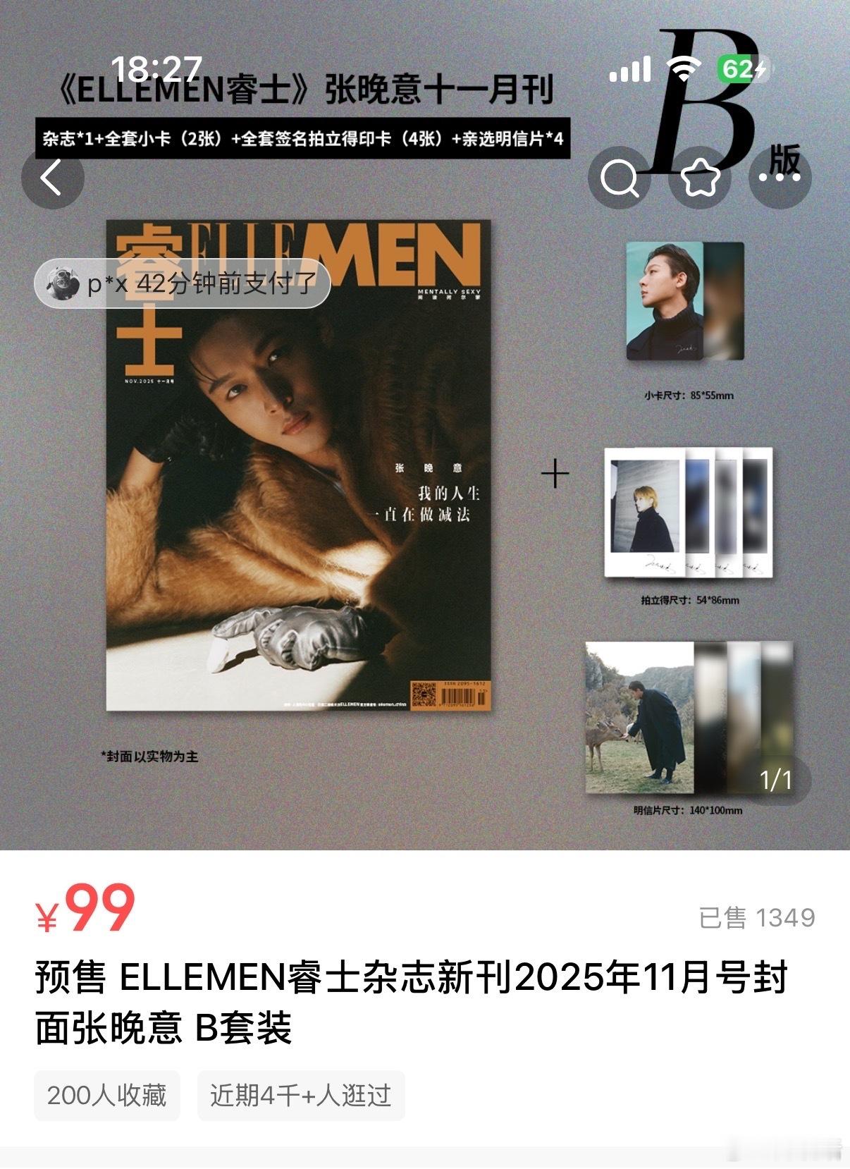 张晚意《睿士ELLEMEN》11月刊杂志5个小时销售销售额75w,离内娱top