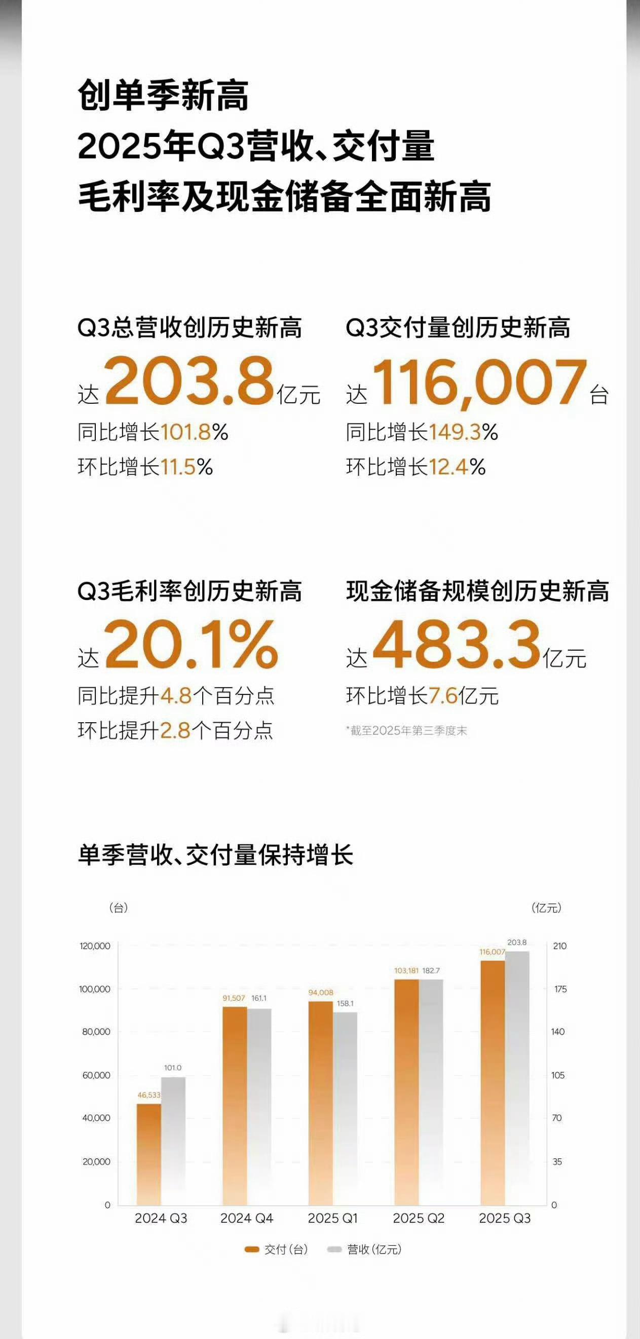 小鹏出息了,销量这么强看看财报更狠!今年 Q3财报全线创历史新高,交付 11.6 万、营收 203.8 亿、毛利率第一次冲上 20.1%目前现金储备来到 483.3 亿,接下来小鹏还有增程、机器人业务、大众合作陆续推进,小鹏真的跟之前的自己不是一个跃进了~