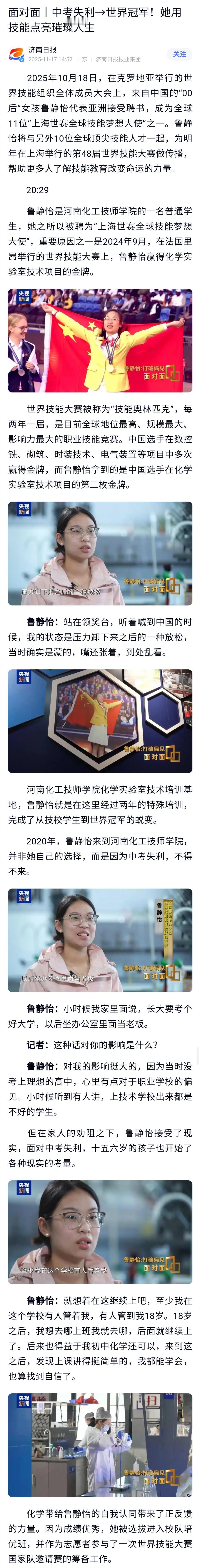 这名世界技能大赛冠军说,“小时候听到有人讲,上技术学校出来都是不好的学生。” 这其实是很多教师、家长对孩子进行的恐吓式教育。这不但给孩子从小灌输对技能人才的歧视、偏见,也阻碍学生的成才选择。 教师、家长希望以此促使学生“刻苦学习”,今后不用做体力活,打螺丝,从事技能工作。但不能无视一个现实:社会需要最多的是技能人才,很多孩子今后也必然从事技能工作。 灌输给他们的偏见与歧视,最终会扭曲他们的职业价值观,如果只能读技校,只能从事技能工作,他却不接受,自暴自弃、摆烂成为问题少年,家长怎么办? 哪怕普及普高,所有学生都上普高,同龄人中的大多数都会是普通劳动者,如果没有成为父母所期待的“成功者”,又缺乏对自己从事职业的认同,他们怎么对待自己的人生? 一句话,别再搞恐吓教育,灌输给孩子扭曲的成功观与职业价值观。恐吓除了制造焦虑、内卷外,并不利于孩子成人、成才。