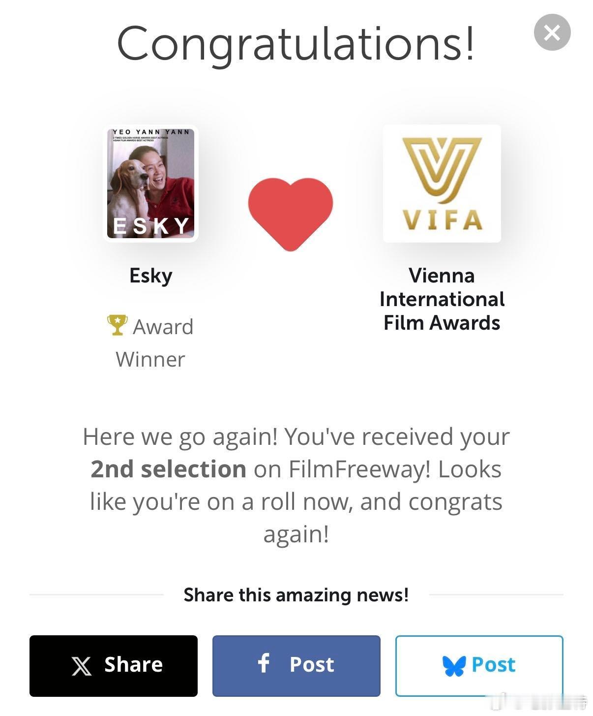 恭喜马来西亚艺人 凭借首次执导的短片《ESKY》再度斩获大奖。继拿下“好莱坞最佳独立电影节”最佳新晋导演奖后,他再度拿下“维也纳国际电影奖”最佳导演奖,以新人导演身份两获国际大奖。王冠逸此前因《延禧攻略》中“海兰察”一角被国内观众熟知,凭借扎实演技积累了不错的业内口碑。此次跨界转型导演,他邀请到金马影后杨雁雁主演,演绎人与狗狗之间的温情故事,展现出过人的创作天赋。影片运用黑白与彩色交替的镜头语言,以细腻笔触表现出丰富的情感层次,成功打动海外评审。从演员到导演,王冠逸完成了一次漂亮的跨界突破,也期待他未来能继续以创作者身份,带来更多优质影像作品。