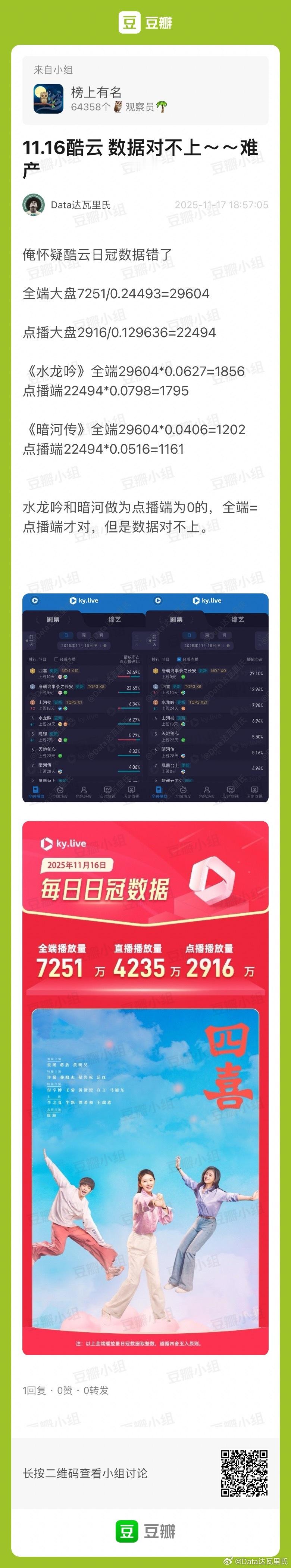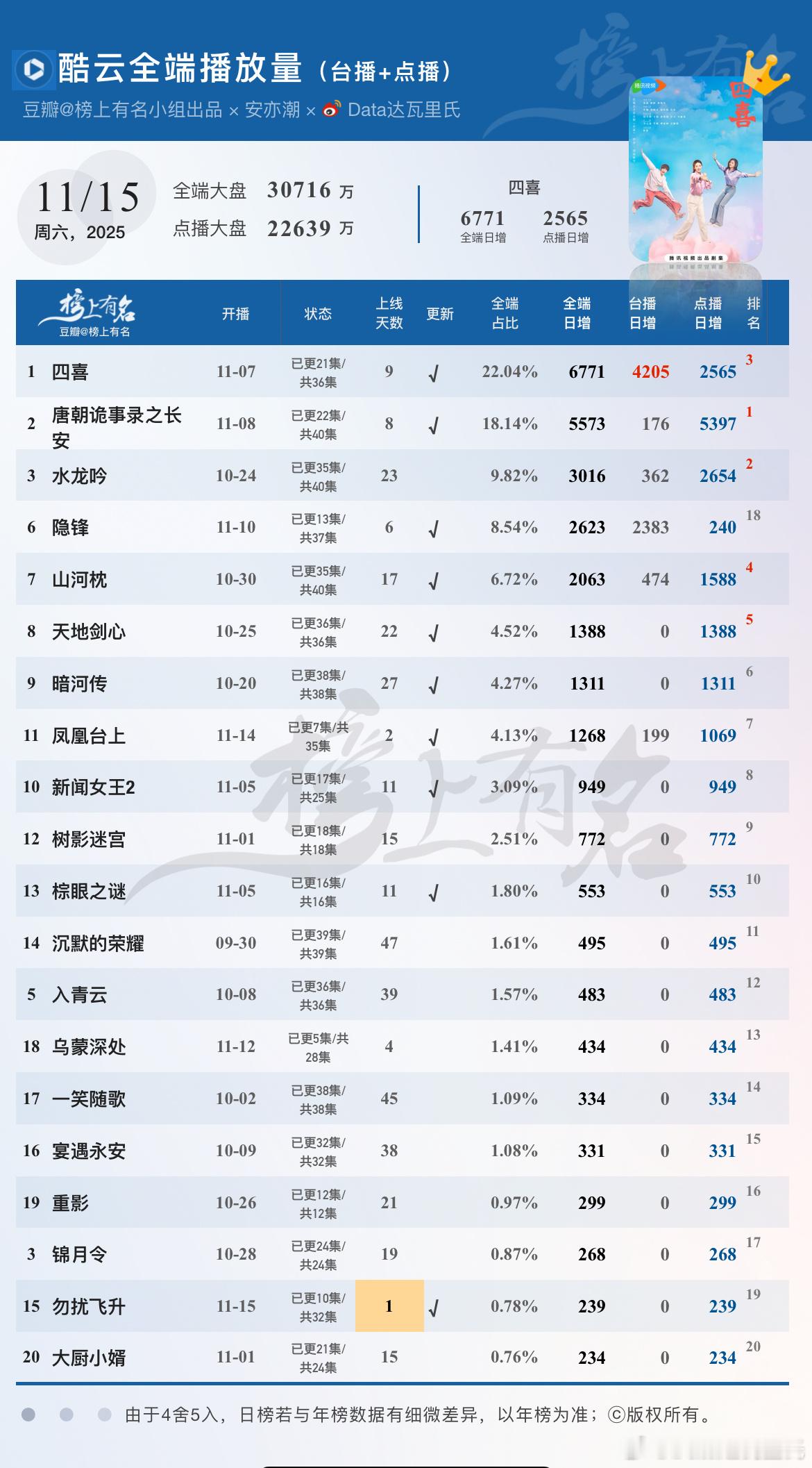 11.16酷云播放量/11.15酷云播放量🌴豆瓣榜上有名小组出品15号的一起补上,经检验酷云日冠《四喜》点播端的数据应该是3016,否则数据就对不上了 全端日冠×10,7251,点播端破3000万涨450万… 全端6705,点播6307涨910万~~~大🛫,点播集均破2000万❗️ 全端1878,点播1615 1857降800万😓 1278降110 1201降110 1150第三天涨80万 942 朱珠霍建华首播366万 集均2112万 集均2041万