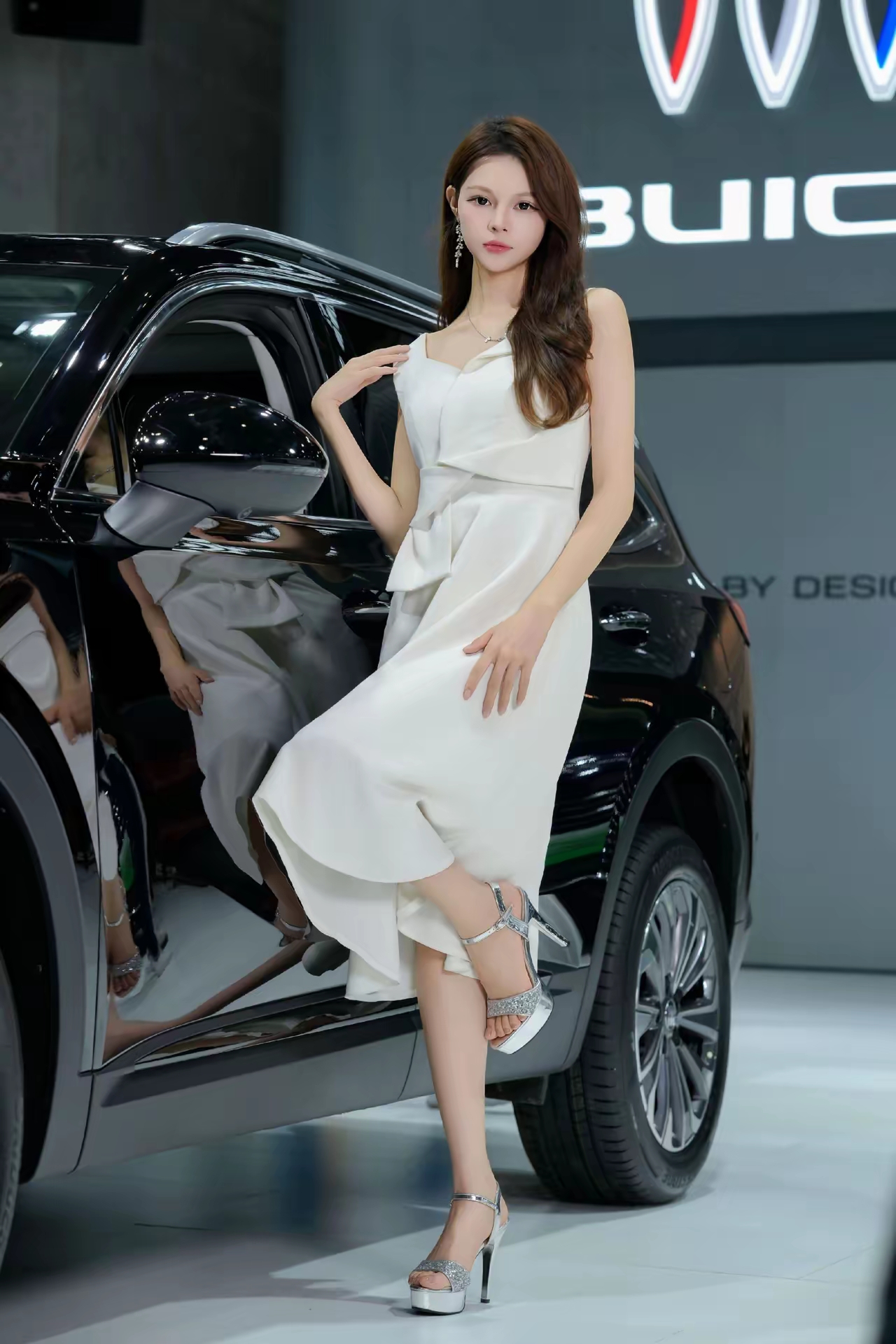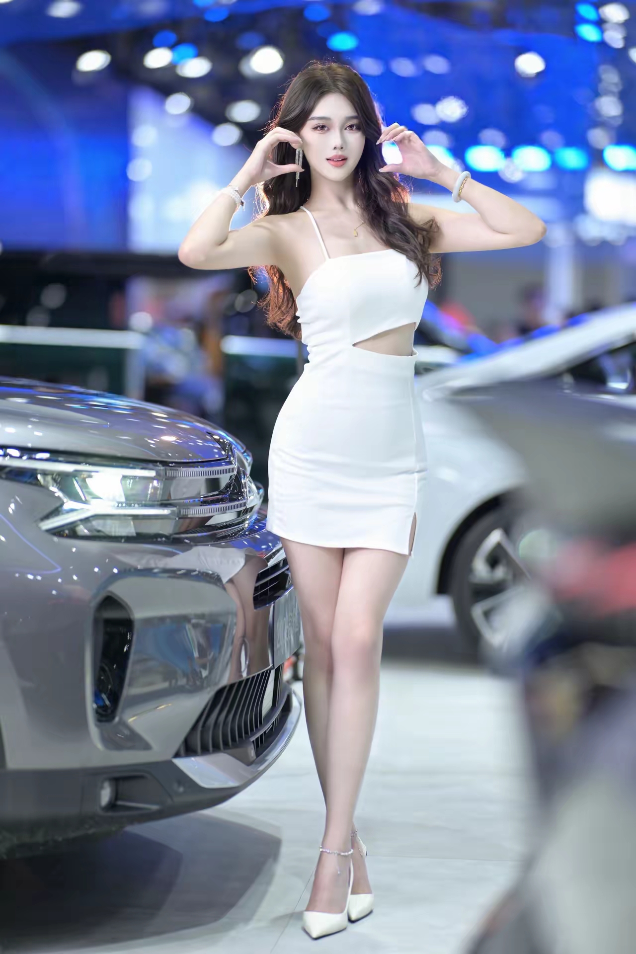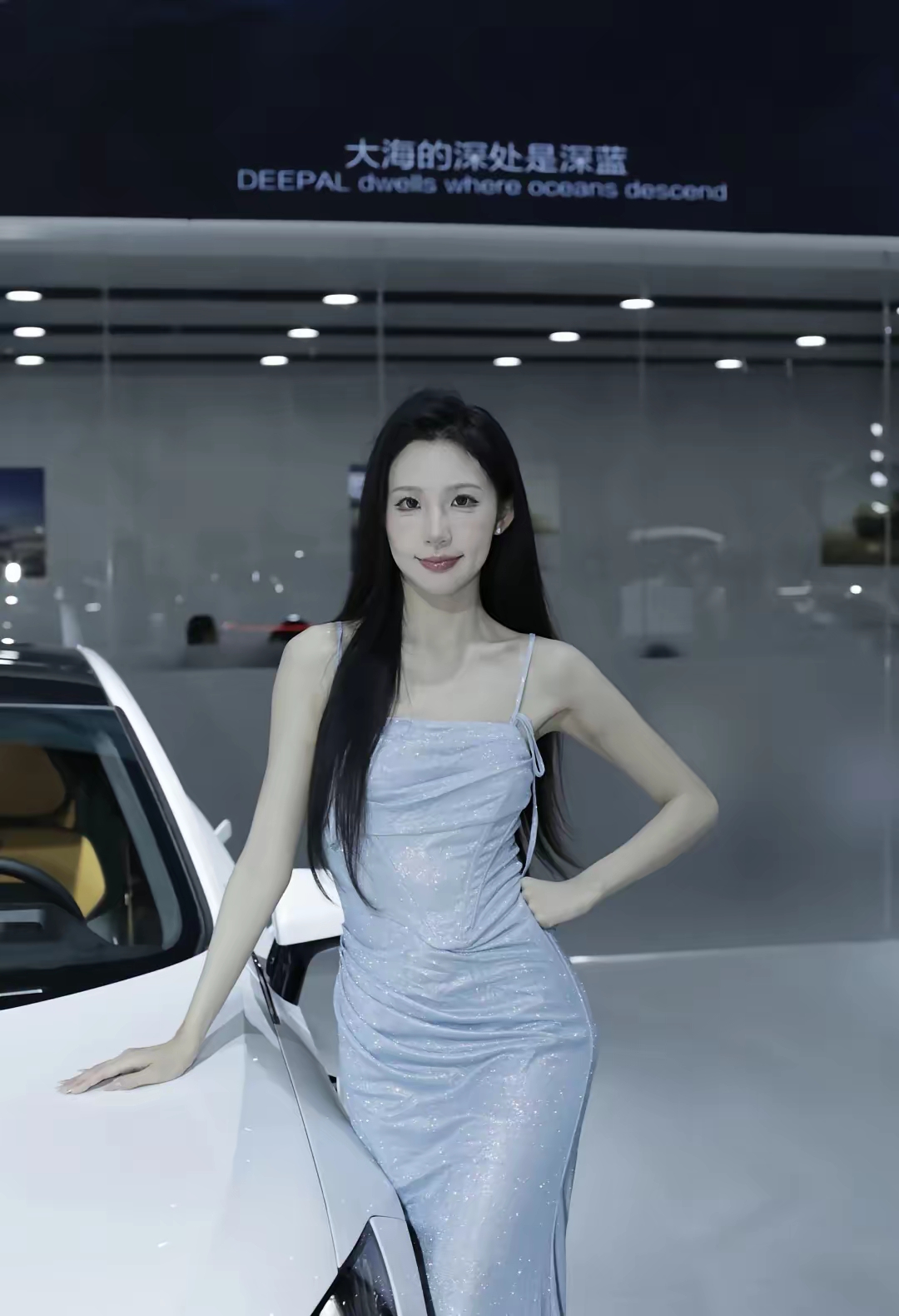 2023年4月上海车展上,有位身着粉色珍珠长裙的车模小姐姐,宛如一只美...