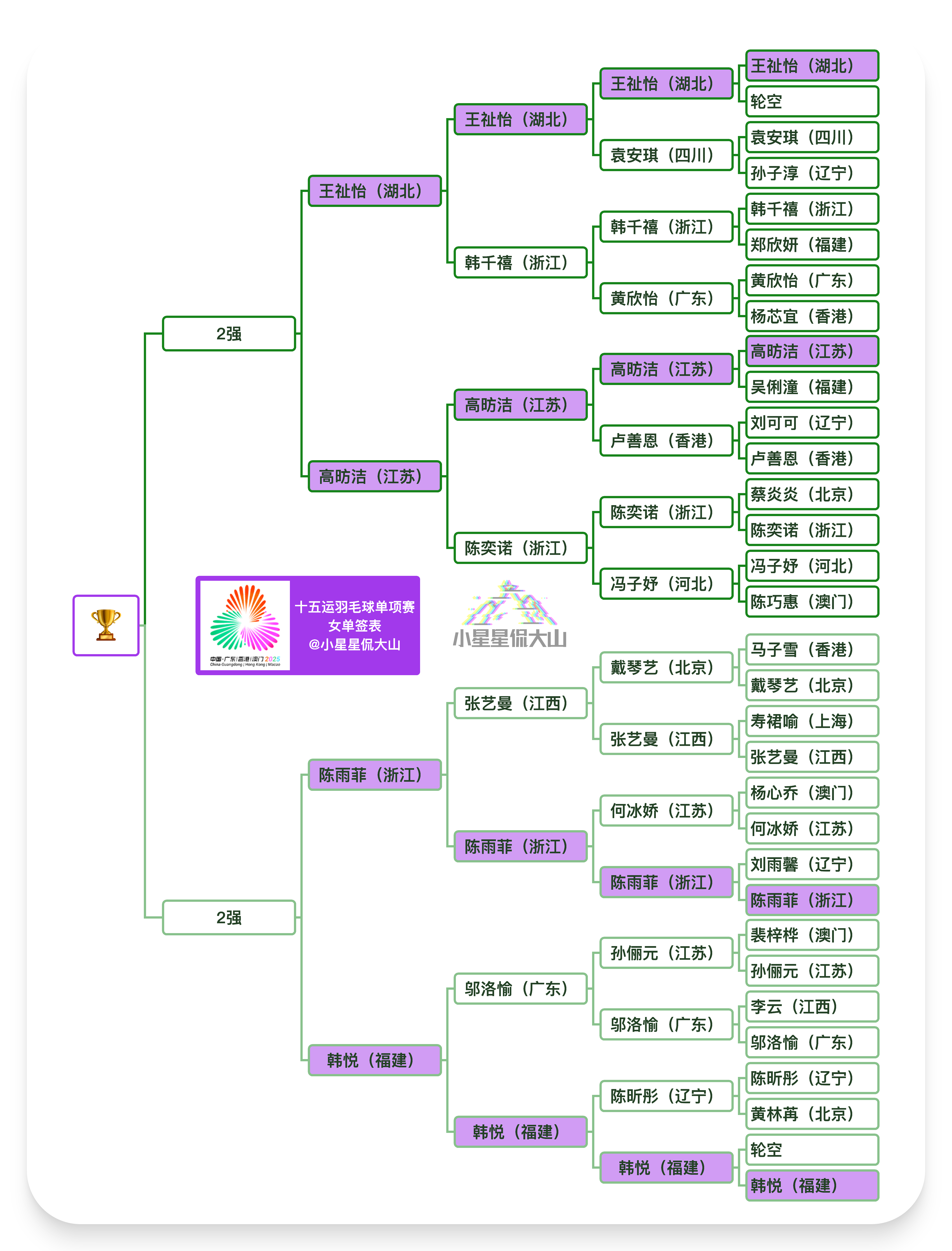 🌟全运会羽毛球单项赛女单4强出炉!【上半区】王祉怡(湖北)🆚(江苏)高昉洁【下半区】陈雨菲(浙江)🆚(福建)韩悦