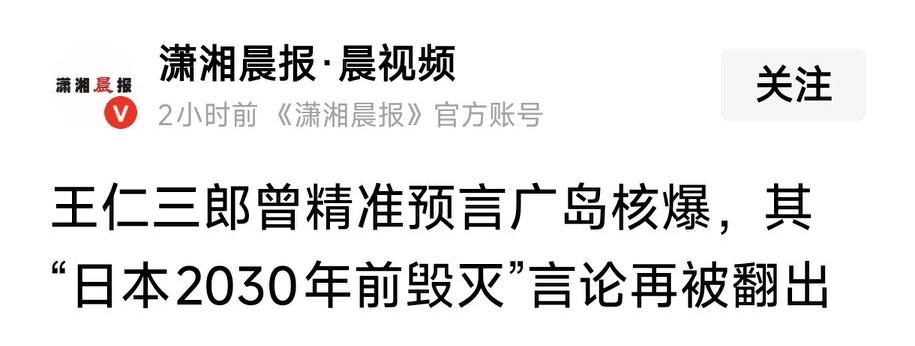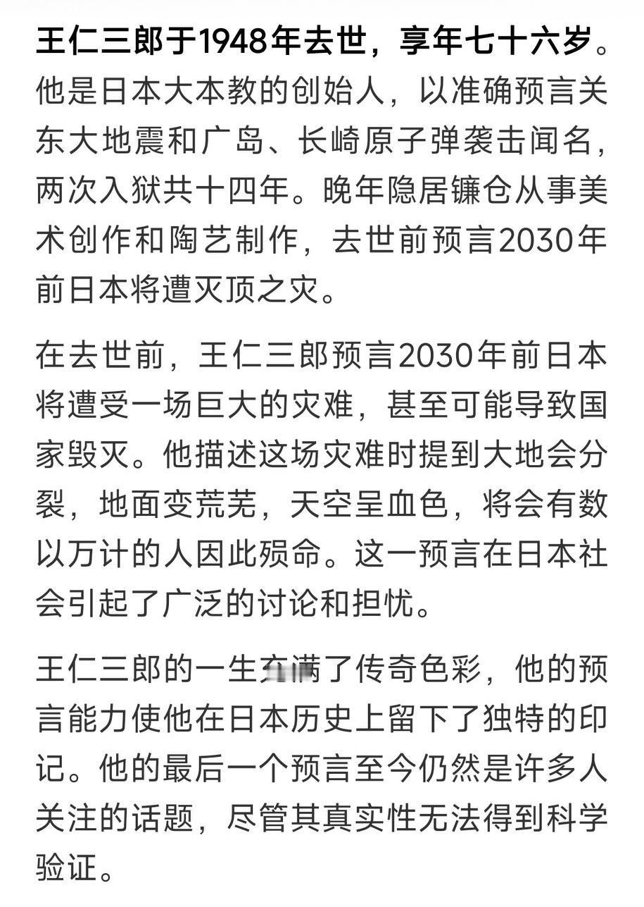 旧事重提,那个王仁三郎曾精准预言广岛核爆一事竟真的应验了。他临终前还预言“日本2030年前毁灭”!瞧瞧如今高市的激进言论,虽说军国主义谈不上横行,但也相差无几,他们总是幻想着有朝一日能重现二战前日本的所谓“盛况”。 然而,日本这些人忘了,如今的中国早已今非昔比,已然强大到能随时给你教训的地步。 要是不知悬崖勒马,日本真有亡国的可能。 对此你作何看法?