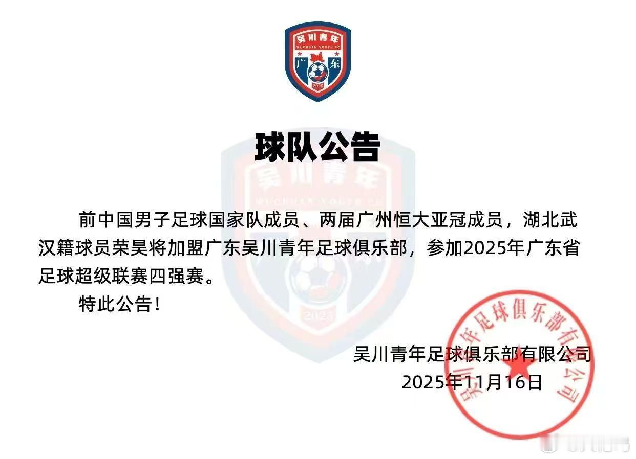 都爱叫他荣老板,但实际上还是最熟悉荣昊穿球衣征战绿茵赛场的样子……记得上次搞退役仪式时就和大家依依不舍,如今重披战袍,还是标志性红色,让大家非常期待!省超四强赛,因此而更有看点了,吴川青年半决赛与广东蜀地红的首回合较量将于23日下午在湛江奥体中心上演,有时间且喜欢荣昊的球迷朋友,可密切关注哦,值得期待