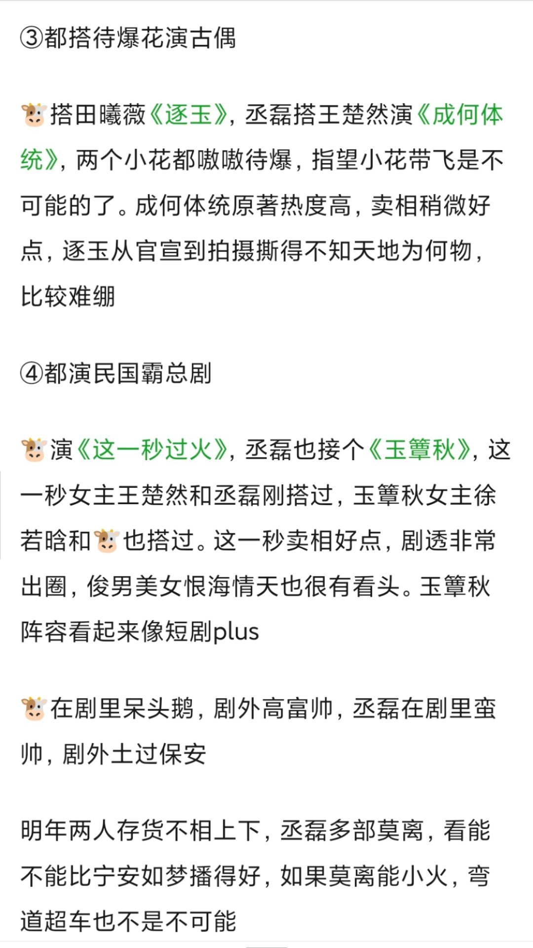 网友热议,张凌赫、丞磊的戏路是撞款了吗?都是古偶男二火的、女主雷同率超标(都搭过🍍🚢若晗)、还都演了民国虐恋男主。🐮🆑明年的大IP古偶《逐玉》《成何体统》此为一战,民偶101《这一秒过火》《玉簟秋》此为二战