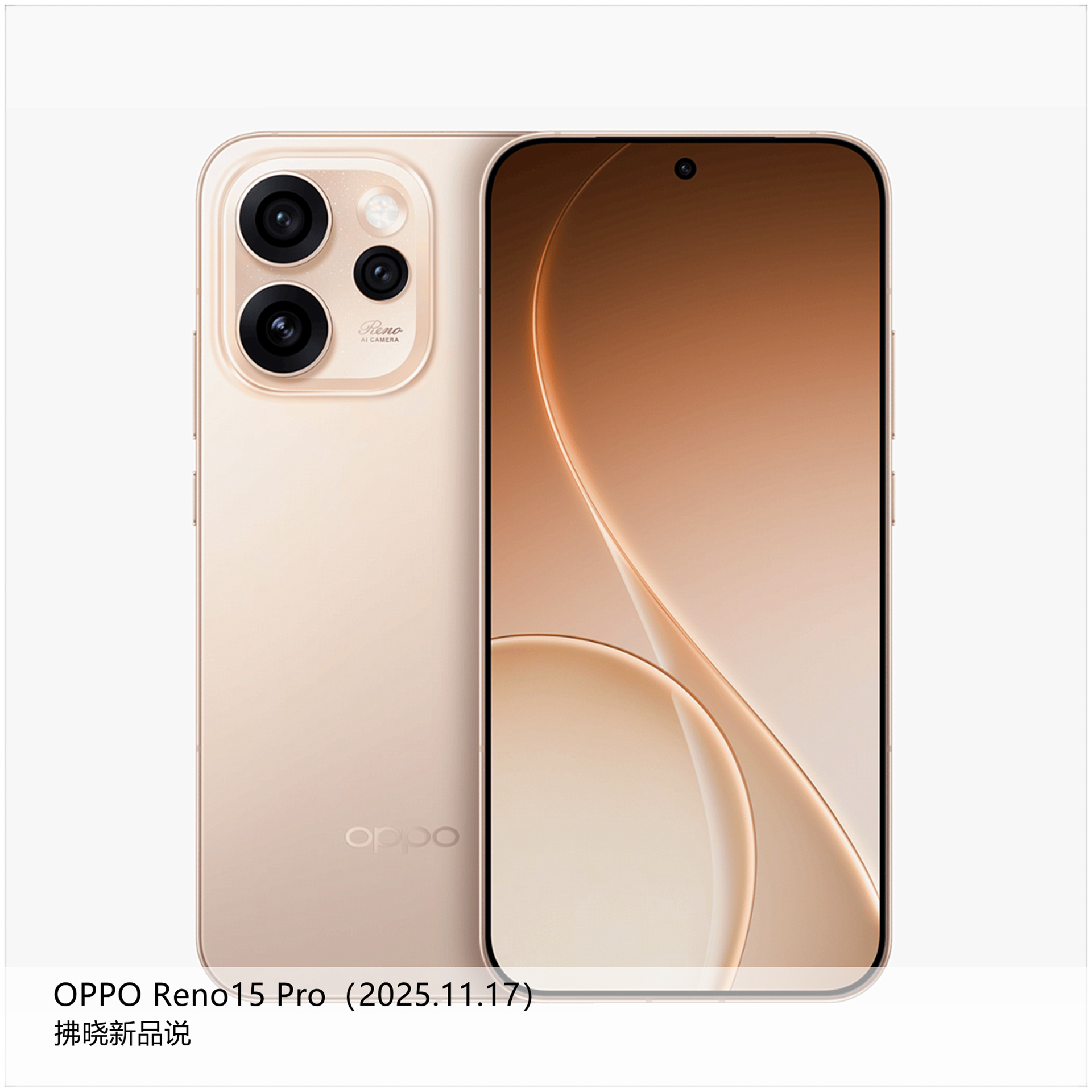 【拂晓新品说】OPPO Reno15系列:(1)OPPO Reno15:- 发布时间:2025年11月17日;- 处理器:联发科 天玑8450;- 存储:LPDDR5X+UFS 3.1;- 屏幕:6.32英寸AMOLED居中打孔屏、2640×1216分辨率、120Hz屏幕刷新率+240Hz触控采样率、3600nit局部峰值亮度、3840Hz PWM调光、460 PPI、93.4%屏占比、屏下指纹识别;- 影像:后置2亿像素广角主摄(OIS、24mm等效焦距、f/1.8)+5000万像素超广角镜头(116°FOV、16mm等效焦距、f/2.0)+5000万像素长焦镜头(OIS、3.5倍光学变焦、80mm等效焦距、f/2.8)“三摄”,前置5000万像素镜头(100°FOV、18mm等效焦距、f/2.0)“单摄”;- 续航:6200mAh电池+80W有线充电;- 其他:NFC、红外遥控、IP69;预装基于Android的ColorOS 16操作系统,机身厚度约7.99~8.13mm,净重约187~188g;始发“可露丽棕、极光蓝、星光蝴蝶结”三个版本,全系2999起(12GB+256GB/12GB+512GB/16GB+256GB/16GB+512GB/16GB+1TB)。(2)OPPO Reno15 Pro:屏幕升级为6.78英寸AMOLED居中打孔屏(2772×1272分辨率、120Hz屏幕刷新率+240Hz触控采样率、3600nit局部峰值亮度、2160Hz PWM调光、450 PPI、95.5%屏占比、屏下指纹识别);电池提升至6500mAh电池,增加50W无线充电;机身厚度约7.65~7.75mm,净重约205g;始发“可露丽棕、蜜糖金、星光蝴蝶结”三个版本,全系3699起(12GB+256GB/12GB+512GB/16GB+512GB/16GB+1TB)。★注:相关数据源于网络,最终以官方信息为准。