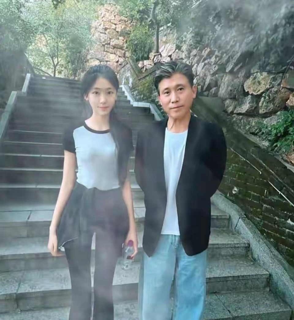 李乃文和老婆女儿到大孤山游玩 夫妻俩都做了挑染发型 看起来很时尚