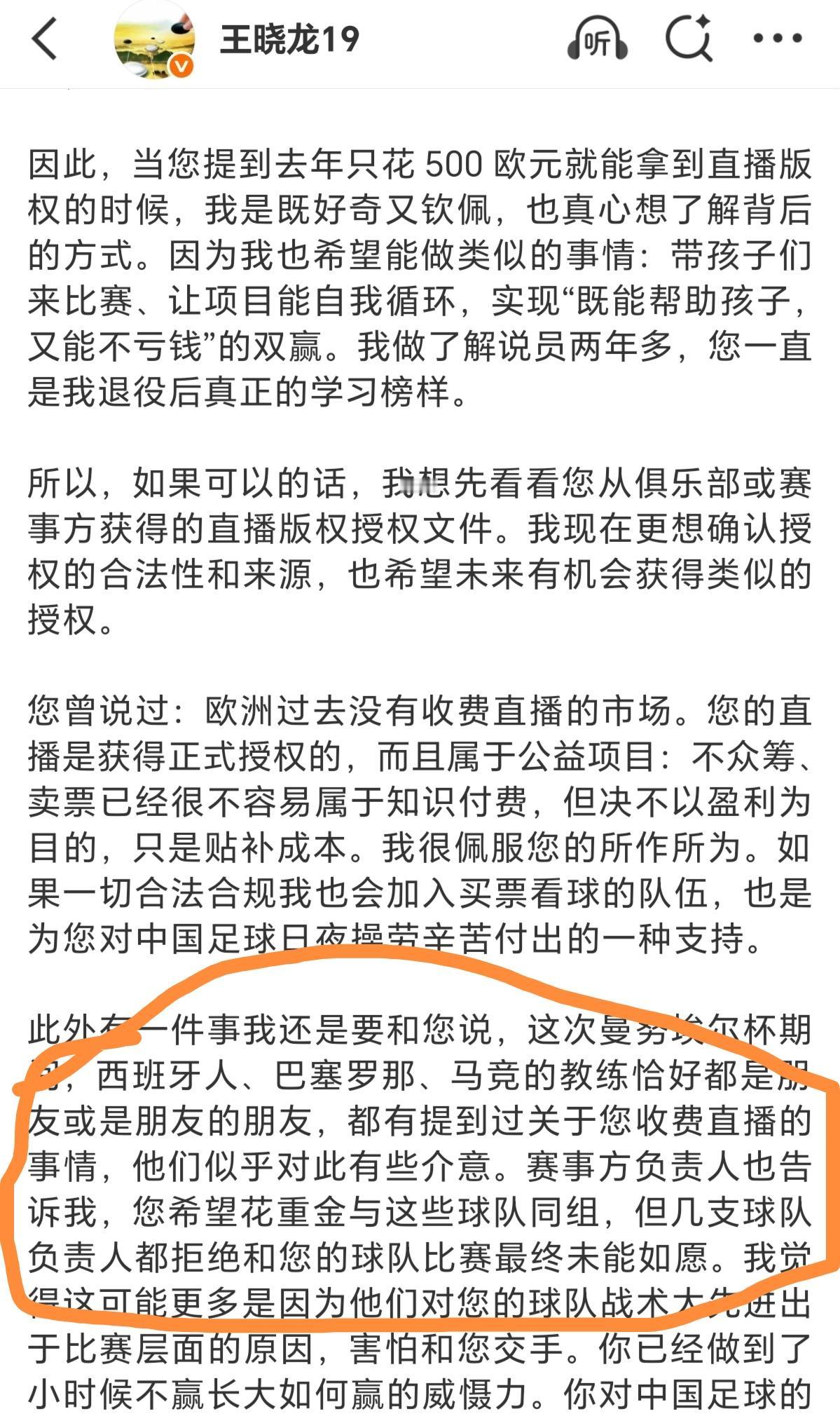 看见王晓龙社媒艾特董路,感觉挺有意思,一年前两人就因为去西班牙比赛的事,互动频繁,结下恩怨,现在王晓龙也带队,去了西班牙,结果和董路之前说的不太一样,所以王晓龙就想向董路学习一下,所以有了下边的发言。 近日,黄健翔、刘越等相继发文,被认为矛头指向董路,而董路这些年和孙继海、孙守东、周海滨,甚至解说员张路,詹俊都有过“争论”“争吵”。而董路凭借三寸不烂之舌,也吸引了众多粉丝支持。 其实而言,在西班牙踢球的孩子多了,大多都比较平庸,几个足球小将的孩子,也并不多么突出,何小柯这个年龄,当年的数据,可比他们强多了,也是国字号头号射手,现在可能也踢不出来了。但是足球小将的名声因为董路的原因,名声都比较大,到哪里还得签名,落地有接机的粉丝,有鲜花,所以自然受到关注比较多。 我们希望每一个孩子都能踢出来,但是随着年龄的增长,一旦变得平庸,名声比较大,受关注比较高的,落差将会更大,心理上可能会更加受不了。所以有时候董路粉丝看起来是喜欢,吹捧小将,可能也是使劲往高处推,荣誉和风险并存。