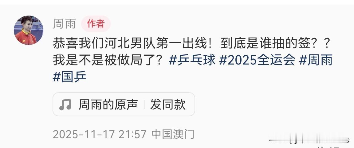 11月17日,乒乓球运动员周雨发文说:“恭喜我们河北男队第一出线!到底是谁抽的签?我是不是被做局了?” 为什么周雨会这么问呢?因为明天河北队将对阵上海队,这就是说周雨有可能又要碰到樊振东,我真的笑死了。 乒乓球男子单打比赛中,周雨被樊振东剃了个光头,直言完全打不过东东。 周雨以前也是八一队的运动员,我原来只觉得周雨和樊振东关系很好,没想到东东和周恺关系也不错,要是八一队还在就好了。 今天,河北队以总比分3比0战胜辽宁队晋级8强,但辽宁队明天将对战北京队,河北队和辽宁队的运气怎么这么好? 期待河北队与上海队的比赛,周雨加油呀,与樊振东对打时,争取赢一局是一局,大家觉得呢?