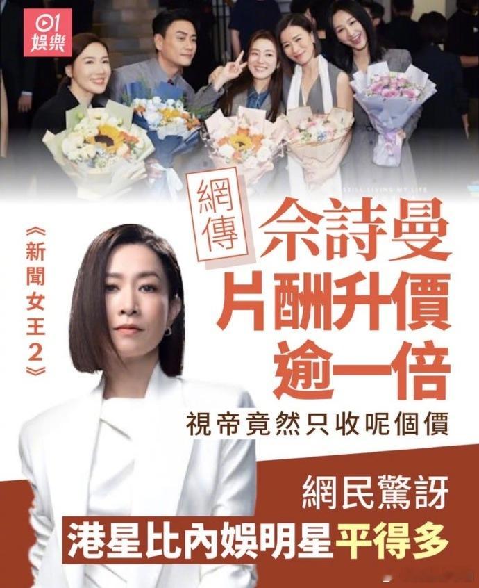 《新闻女王2》佘诗曼100万港元片酬成顶流,黄宗泽、李施嬅50万持平,高海宁35万进阶,这整部剧的酬劳,应该还不及内娱部分明星一集零头吧