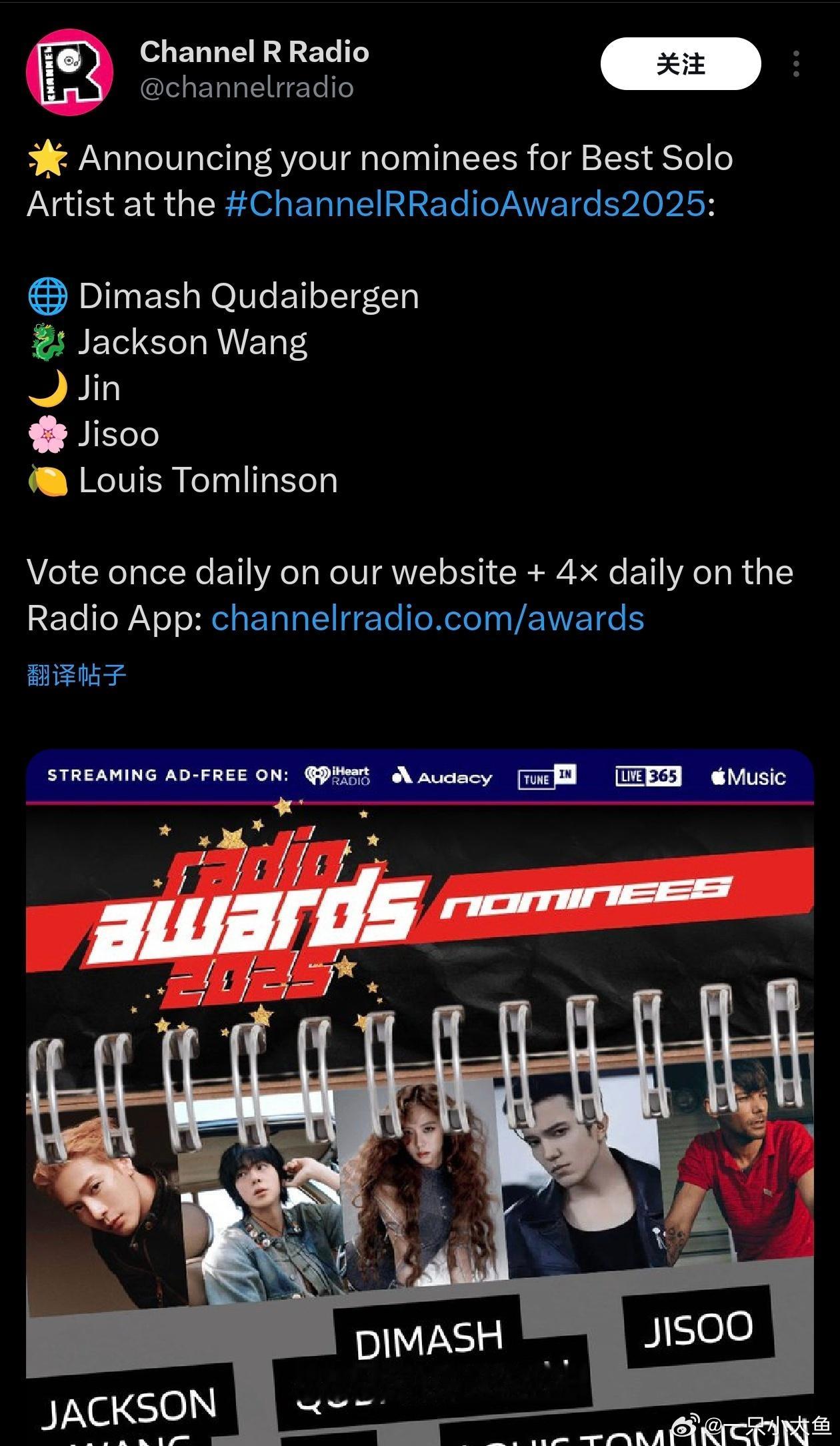 天时地利人和人和王嘉尔占80%·恭喜宝入选ChannelRRadioAwards2025最佳solo艺人提名