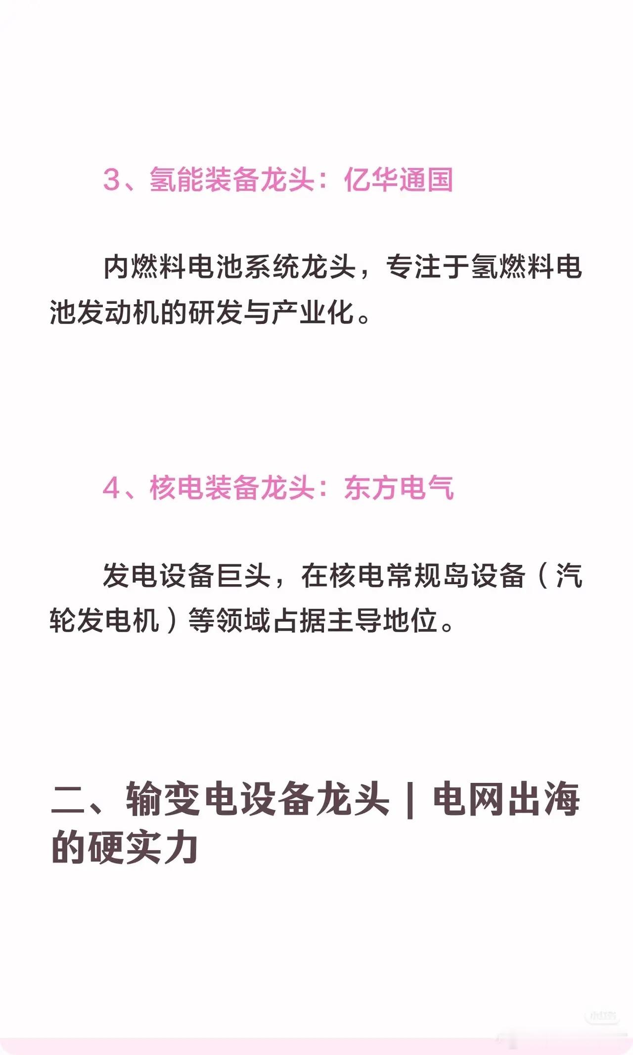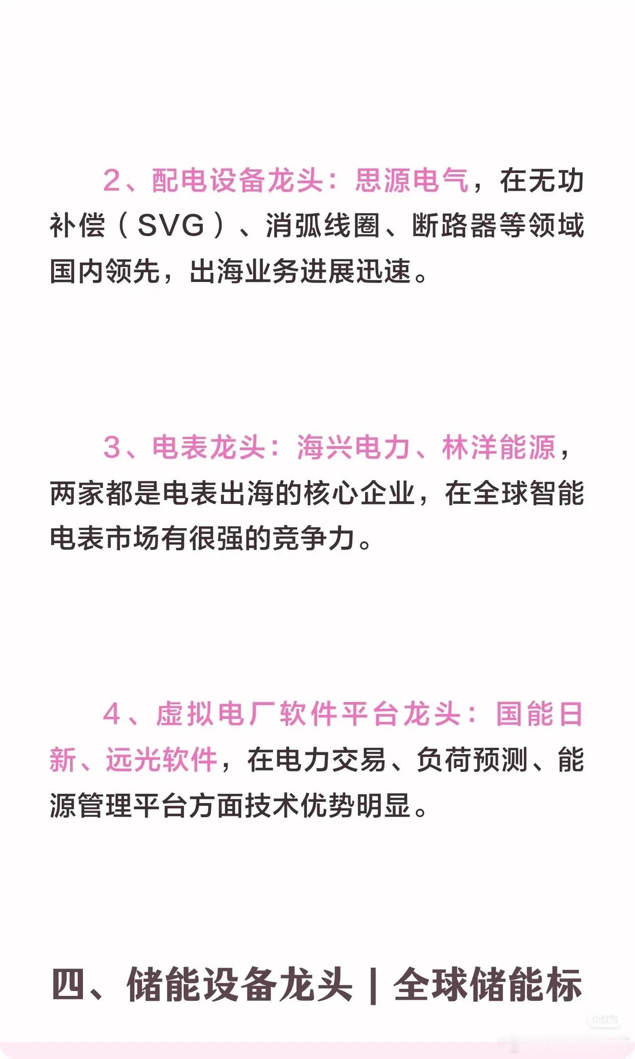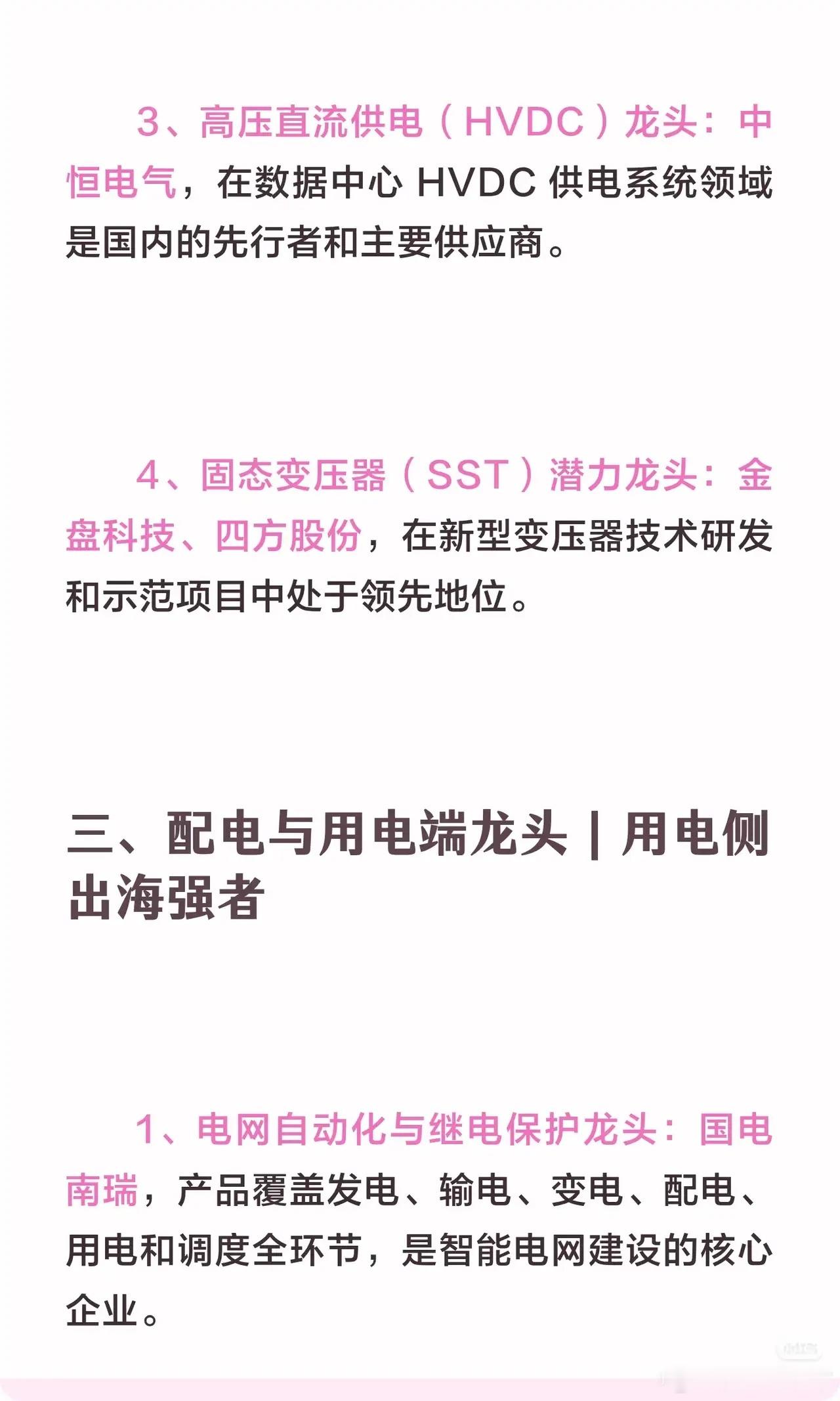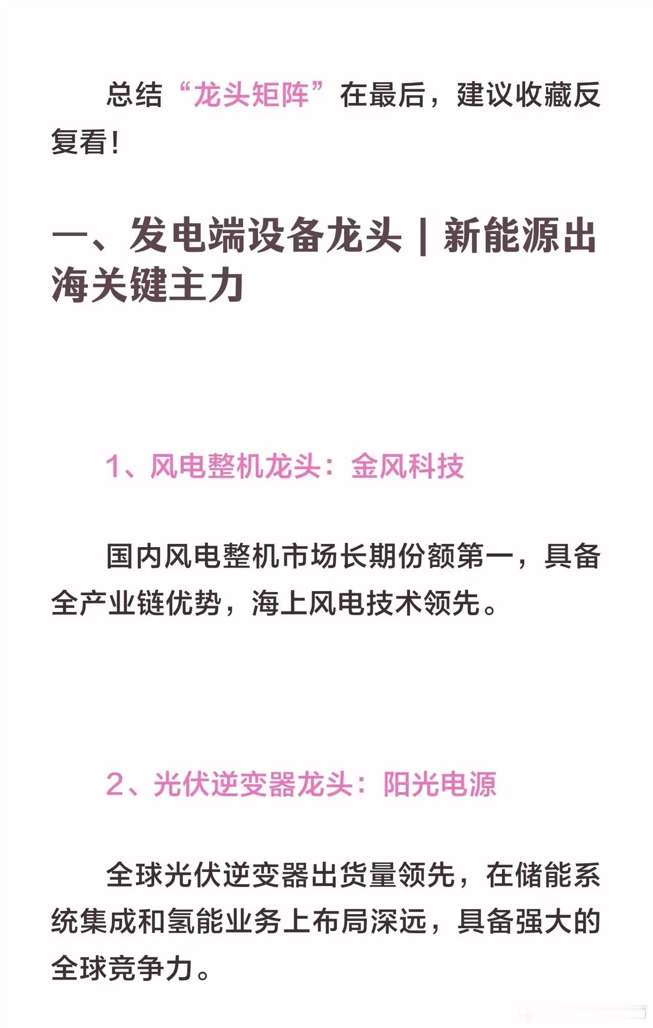 新能源与电力装备领域的核心龙头企业和其优势领域:一、发电端设备龙头——新能源出海的关键主力1. 风电整机龙头:金风科技国内风电整机市场份额长期第一,拥有全产业链优势,海上风电技术领先。2. 光伏逆变器龙头:阳光电源全球光伏逆变器出货量领先,同时在储能系统集成与氢能业务方面布局深远,具备强大的全球竞争力。二、能源装备与新型电力系统核心企业3. 氢能装备龙头:亿华通国内燃料电池系统领先企业,专注于氢燃料电池发动机研发与产业化。4. 核电装备龙头:东方电气发电设备巨头,在核电常规岛设备(如汽轮发电机)领域占据主导地位。三、输变电设备龙头——电网出海的硬实力5. 特高压与柔性直流输电核心企业 - 特高压直流输电铁三角:国电南瑞(控制保护系统垄断优势)、许继电气、中国西电(换流阀及直流开关主导)。 - 柔性直流输电龙头:国电南瑞(控制系统和阀厅监控领先)、中天科技(海缆技术先进、项目经验丰富)、许继电气。四、配电与用电端龙头——用电侧出海强者6. 高压直流供电(HVDC)龙头:中恒电气数据中心HVDC供电系统的国内先行者与主要供应商。7. 固态变压器(SST)潜力龙头:金盘科技、四方股份在新型变压器技术研发和示范项目中处于领先地位。8. 电网自动化与继电保护龙头:国电南瑞智能电网建设核心企业,产品覆盖发电到调度全环节。9. 配电设备龙头:思源电气在无功补偿、消弧线圈、断路器等领域国内领先,出海业务发展迅速。10. 电表龙头:海兴电力、林洋能源全球智能电表市场的重要竞争者,出海能力强。11. 虚拟电厂软件平台龙头:国能日新、远光软件在电力交易、负荷预测和能源管理平台方面具备技术优势。五、储能与数据中心相关龙头12. 储能电池龙头:宁德时代全球动力与储能电池双领域标杆,技术和规模优势显著。13. 数据中心供电与散热相关龙头 - 柴油发电机组龙头:潍柴动力,大缸径发动机是高端备用电源选择,正加速出海。 - 数据中心配电龙头:良信股份。14. 虚拟电厂与电力软件平台(重复提及):国能日新、远光软件,技术优势体现在电力交易与能源管理。六、出海核心部件与关键技术供应商15. 变压器分接开关龙头:华明装备全球仅有的两家主要供应商之一,技术壁垒高,直接受益于全球变压器产能扩张。16. 液冷技术布局企业:英维克、高澜股份、淳中科技、麦格米特等,积极拓展服务器液冷解决方案。17. 非晶合金材料龙头:云路股份全球最大非晶合金薄带供应商,节能特性突出,是配电变压器核心材料。18. 取向硅钢龙头:望变电气打通“取向硅钢—变压器”一体化产业链,受益于变压器需求增长与国产替代。19. 干式变压器龙头(出海标杆):金盘科技海外收入占比高,是全球领先的特种变压器制造商。20. 高频变压器龙头(受益AI供电):伊戈尔是数据中心供电模块的核心供应商,直接受益于AI数据中心(AIDC)建设。21. 中高频变压器核心供应商(绑定华为等)深度合作华为,直接受益于AIDC建设浪潮。七、综合型巨头——输配电一体化全能选手22. 输配电一体化巨头:特变电工在变压器产能、多晶硅生产、输变电工程总包等领域均处于全球领先地位,综合实力极其雄厚。八、按企业特质分类总结(第10张图提炼)1. 技术壁垒高的企业:华明装备(分接开关)、云路股份(非晶材料)。2. 全球综合实力强的企业:国电南瑞(电网自动化&特高压控制)、宁德时代(储能电池)、特变电工(变压器&工程)。3. 出海业务纯正的企业:金盘科技(干变)、海兴电力(电表)、思源电气(配电设备)、伊戈尔(高频变压器)等。4. 最直接受益于AIDC(人工智能数据中心)建设的企业:潍柴动力(柴发)、伊戈尔(高频变压器)、良信股份(低压配电)、以及众多液冷技术公司。总结整份内容围绕“龙头矩阵”展开,系统梳理了从发电、输电、变电、配电到用电及储能、数据中心等全产业链环节中的中国核心龙头企业,这些企业在技术、市场、全球化、产业链整合等方面具备显著优势,是推动新能源与新型电力系统国际化的中坚力量。建议收藏反复参考,以便快速了解各细分赛道的领军企业及其核心竞争力。