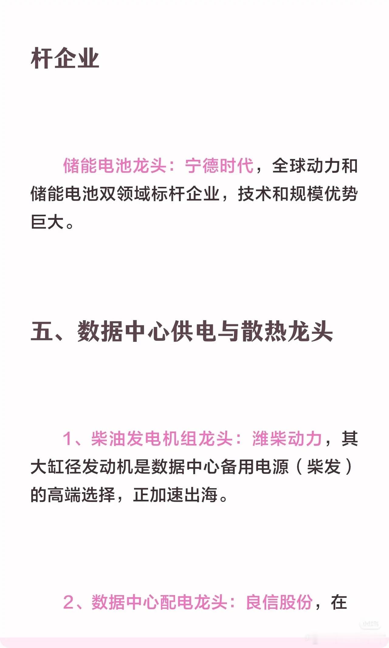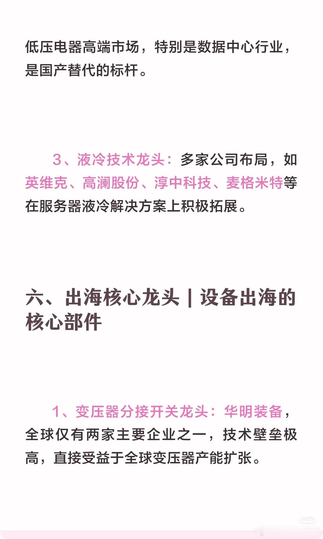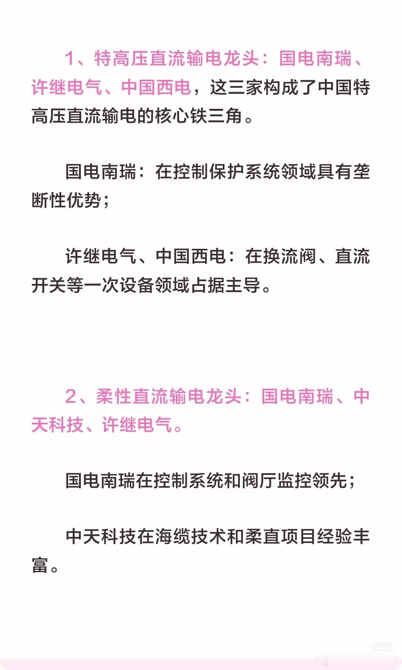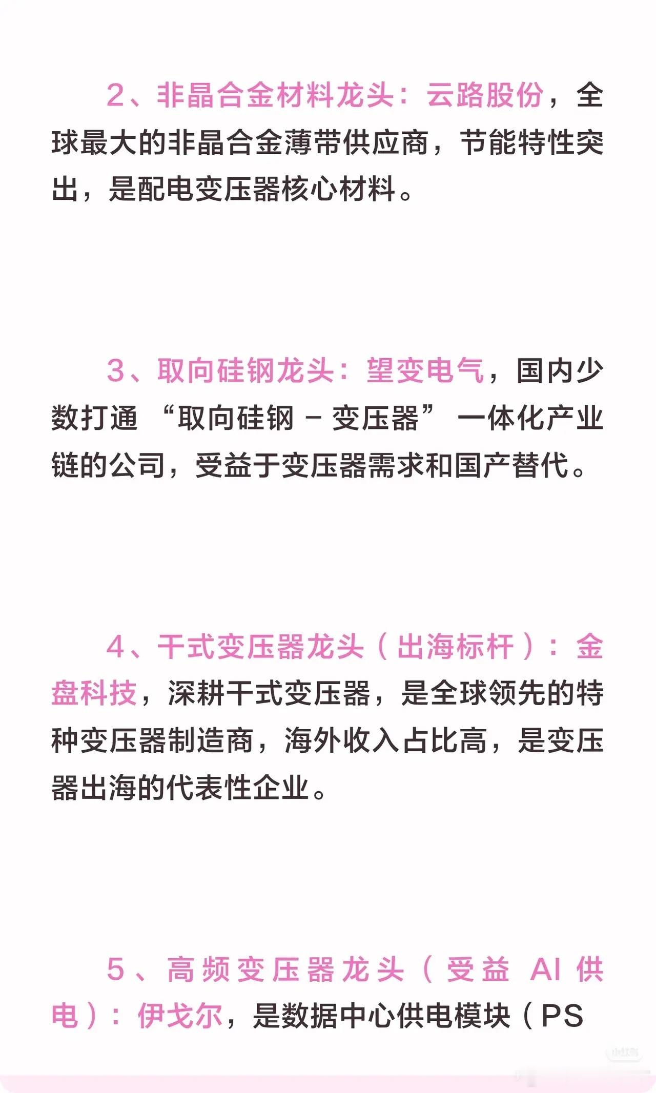 新能源与电力装备领域的核心龙头企业和其优势领域:一、发电端设备龙头——新能源出海的关键主力1. 风电整机龙头:金风科技国内风电整机市场份额长期第一,拥有全产业链优势,海上风电技术领先。2. 光伏逆变器龙头:阳光电源全球光伏逆变器出货量领先,同时在储能系统集成与氢能业务方面布局深远,具备强大的全球竞争力。二、能源装备与新型电力系统核心企业3. 氢能装备龙头:亿华通国内燃料电池系统领先企业,专注于氢燃料电池发动机研发与产业化。4. 核电装备龙头:东方电气发电设备巨头,在核电常规岛设备(如汽轮发电机)领域占据主导地位。三、输变电设备龙头——电网出海的硬实力5. 特高压与柔性直流输电核心企业 - 特高压直流输电铁三角:国电南瑞(控制保护系统垄断优势)、许继电气、中国西电(换流阀及直流开关主导)。 - 柔性直流输电龙头:国电南瑞(控制系统和阀厅监控领先)、中天科技(海缆技术先进、项目经验丰富)、许继电气。四、配电与用电端龙头——用电侧出海强者6. 高压直流供电(HVDC)龙头:中恒电气数据中心HVDC供电系统的国内先行者与主要供应商。7. 固态变压器(SST)潜力龙头:金盘科技、四方股份在新型变压器技术研发和示范项目中处于领先地位。8. 电网自动化与继电保护龙头:国电南瑞智能电网建设核心企业,产品覆盖发电到调度全环节。9. 配电设备龙头:思源电气在无功补偿、消弧线圈、断路器等领域国内领先,出海业务发展迅速。10. 电表龙头:海兴电力、林洋能源全球智能电表市场的重要竞争者,出海能力强。11. 虚拟电厂软件平台龙头:国能日新、远光软件在电力交易、负荷预测和能源管理平台方面具备技术优势。五、储能与数据中心相关龙头12. 储能电池龙头:宁德时代全球动力与储能电池双领域标杆,技术和规模优势显著。13. 数据中心供电与散热相关龙头 - 柴油发电机组龙头:潍柴动力,大缸径发动机是高端备用电源选择,正加速出海。 - 数据中心配电龙头:良信股份。14. 虚拟电厂与电力软件平台(重复提及):国能日新、远光软件,技术优势体现在电力交易与能源管理。六、出海核心部件与关键技术供应商15. 变压器分接开关龙头:华明装备全球仅有的两家主要供应商之一,技术壁垒高,直接受益于全球变压器产能扩张。16. 液冷技术布局企业:英维克、高澜股份、淳中科技、麦格米特等,积极拓展服务器液冷解决方案。17. 非晶合金材料龙头:云路股份全球最大非晶合金薄带供应商,节能特性突出,是配电变压器核心材料。18. 取向硅钢龙头:望变电气打通“取向硅钢—变压器”一体化产业链,受益于变压器需求增长与国产替代。19. 干式变压器龙头(出海标杆):金盘科技海外收入占比高,是全球领先的特种变压器制造商。20. 高频变压器龙头(受益AI供电):伊戈尔是数据中心供电模块的核心供应商,直接受益于AI数据中心(AIDC)建设。21. 中高频变压器核心供应商(绑定华为等)深度合作华为,直接受益于AIDC建设浪潮。七、综合型巨头——输配电一体化全能选手22. 输配电一体化巨头:特变电工在变压器产能、多晶硅生产、输变电工程总包等领域均处于全球领先地位,综合实力极其雄厚。八、按企业特质分类总结(第10张图提炼)1. 技术壁垒高的企业:华明装备(分接开关)、云路股份(非晶材料)。2. 全球综合实力强的企业:国电南瑞(电网自动化&特高压控制)、宁德时代(储能电池)、特变电工(变压器&工程)。3. 出海业务纯正的企业:金盘科技(干变)、海兴电力(电表)、思源电气(配电设备)、伊戈尔(高频变压器)等。4. 最直接受益于AIDC(人工智能数据中心)建设的企业:潍柴动力(柴发)、伊戈尔(高频变压器)、良信股份(低压配电)、以及众多液冷技术公司。总结整份内容围绕“龙头矩阵”展开,系统梳理了从发电、输电、变电、配电到用电及储能、数据中心等全产业链环节中的中国核心龙头企业,这些企业在技术、市场、全球化、产业链整合等方面具备显著优势,是推动新能源与新型电力系统国际化的中坚力量。建议收藏反复参考,以便快速了解各细分赛道的领军企业及其核心竞争力。