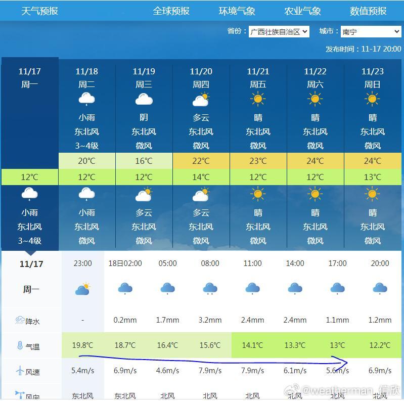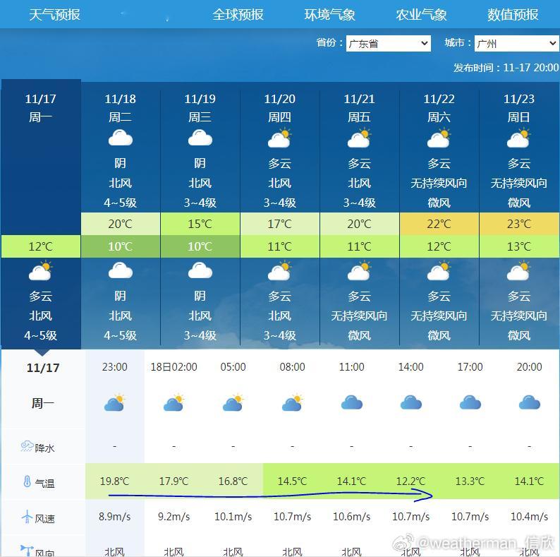 【18日华南将遭遇强降温】今天在寒潮到来前,海南广东部分站点,气温超30℃。不过明天寒潮到来,广东广西多地降温将超10℃,广东西部-广西中南部的部分站点,明天下午对比今天下午,降温可达16℃以上。明天因为还有阴雨,广州、南宁的气温将出现倒降,今晚预报的未来24小时最高气温,就是在今晚。而明天下午的气温比今晚和明天凌晨低,因此明天下午气温接近最低气温,不到15℃。请参考最低气温穿衣。