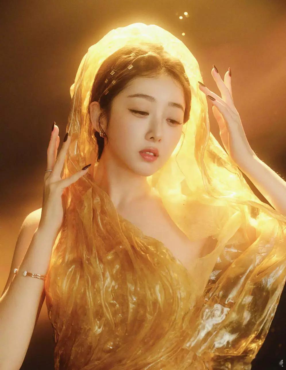 蒋梦婕穿着金色长裙,头披金色薄纱,在暖光下尽显典雅。