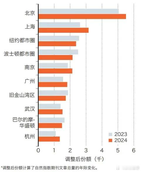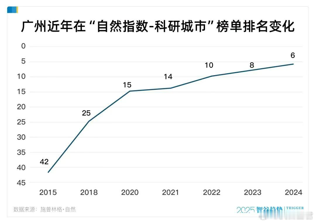 打破天花板,科研实力跃升全球第六,广州到底厉害在哪里?重磅消息,震动全球科技界。刚刚发布的“2024自然指数-科研城市”显示,中国科研实力再创新高,首次包揽“全球科研城市十强榜单”一半以上席位。北京保持榜首,上海位列第二。十强选手中,上升势头最猛的是广州,从第八位强势跃升至第六位,一举超越硅谷所在的旧金山湾区。(2024年“自然指数”十强科研城市)今年以来,广州科技创新实力已多次“破圈”。就在不久前,广深港科创集群刚刚登顶全球第一,历史性地超越了“东京-横滨”,引发全球关注。为什么以商贸和枢纽门户闻名的“千年商都”,竟然爆发出如此惊人的科研实力?广州,到底厉害在哪里?先了解一下“自然指数”的含金量。该指数由全球知名学术机构施普林格-自然出版集团编制,基于82种高质量自然科学期刊的论文产出数据产生。没错,就是那家旗下拥有顶级学术期刊《自然》杂志的机构,其管理的多本期刊长期居于全球影响因子排名前列。“自然指数”也被列为诸多国际科研机构评估的重要参考。回顾广州近年来在“自然指数-科研城市”榜单上的排名,可以说是一路狂飙。广州的崛起,绝非偶然。这一连串跃升的背后,是广州科研实力的全面开花,在《2024年全球高质量科研领先城市》列出的五大子榜单中,广州每个领域的排名均进入全球前十,堪称没有短板的“六边形战士”。在物理科学,广州排名第六;生命科学,广州排名第九;化学领域,广州排名全球第四;地球环境科学,广州排名第三;健康科学,广州排名第十;比如,在地球与环境科学领域,依托中科院广州地化所等顶尖机构,研究团队通过嫦娥六号带回来的月球样品尽心分析,首次揭示了月球背面的火山活动历史,为月球资源开发和深空探测提供了科学依据,成为全球该领域的科研高地。广州的科技研发,为何进步飞速?一个直观的原因是,全社会的重视程度不断提高,投入也在持续加大。2024年,广州全社会研发经费首次超过千亿元大关,是全国唯一实现研发投入强度连续十年增长的一线城市。据Web of Science统计,2024年广州共发表科研论文70843篇,同比增长10.86%。越来越多的科研人才也在“用脚投票”,选择到广州发展。2024年,广州引进人才入户近3万人。广州全市82所高校,每年毕业生超60 万人,留穗率达65%。但如果你认为广州的科研之强,仅仅体现在数量级上,那就是一个大大的误会了。广州的实力,远远不止于此。比起火山喷发一般的科研成果和论文数量,广州更恐怖的实力,在于科研产业转化。你知道吗?广州是全国唯一一个聚集国家实验室、综合类国家技术创新中心、国家重大科技基础设施、国际大科学计划等国家级重大平台的城市,集聚央省级科研院所41家、省高水平创新研究院14家,84所高校总数居全国第二,ESI前1%学科达150个,堪称拥有一支实力超强的科研“国家队”。图源:广州日报依托其深厚的制造业底蕴,广州打造出“研产一体”的科研创新生态。2024年,广州的独角兽企业增至24家、数量居全球城市第九。比如,在最前沿的人工智能领域,广州企业文远知行、小马智行就先后赴美敲钟,分别成为“全球通用驾驶第一股”与“全球Robotaxi第一股”;在新一代信息技术领域,粤芯半导体实现12英寸晶圆量产,填补珠三角地区芯片制造能力的空白;在生物科技方面,2023年,云舟生物以70亿估值晋升为全球独角兽企业,也是广州首家获此殊荣的生物科技企业。这种“研产一体”的生态,极大缩短了创新周期,也让广州成为科技成果落地转化的理想试验场。“深圳-香港-广州”创新集群为什么能代表中国,登顶全球创新指数的榜首?这份权威榜单,今年首次新增了“风险资本(VC)交易量”作为第三个指标,衡量创新资本的活跃程度,更加均衡全面。在这一核心指标上,“深港广”集群表现尤为突出——占全球总量的2.9%,高于东京-横滨的2.2%。其中,广州贡献了关键力量。在广深港创新集群中,科学论文发表量排名第一的主体,正是来自广州的中山大学。2024年广州共发表科研论文70843篇,同比增长10.86%,占集群总量的45.32%,体量与增速均领跑集群。在产业转化和风险投资方面,广州更是表现出色。一项可供参照的数据是,投中网统计2024年广州共发生投资事件315起,交易总额突破200亿元,占“广深港”集群三大城市总金额的1/3以上。平均单笔交易额达约6500万元,是三大城市平均值的1.5倍,显示广州风险投资不仅活跃,更具备较高的项目质量和资本认可度。今天的科技竞争,早已不是单一城市的比拼,而是创新生态网络之间的较量。广州的科研实力,只是这座全球一线城市综合实力的一部分,与广州的国家中心城市、综合性门户城市和国际科技创新中心重要承载地的定位相匹配。要知道,从方方面面来看,广州都已经足以傲立在全球最顶级城市之林。2024年底,全球权威世界城市研究机构“全球化与世界城市研究网络”(GaWC)发布的2024年世界城市体系排名中,广州位居第22位,排名大幅提升,不但稳居世界一线城市行列,还创下在该榜单上的最高的历史排名。这一榜单中,中国只有6个城市入选了入选了该名单:香港、北京、上海、广州、台北、深圳。作为该领域的权威榜单,GaWC对城市进行排名的评估维度包括国际知名度、全球事务参与度、人口规模、国际机场、金融与企业总部集聚度、文化机构影响力以及港口等等。
