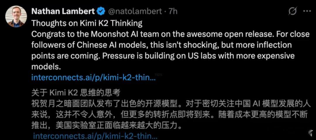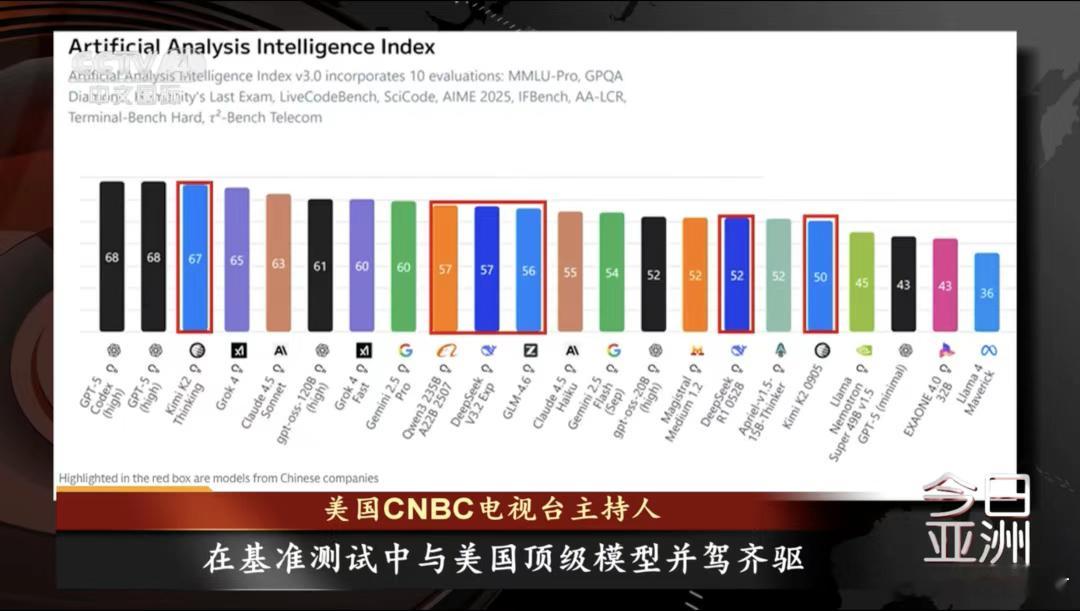 中国AI再次刷屏硅谷!华尔街发出预警,直指美股泡沫中国AI,又给了硅谷亿点点震撼。这两天,一条科技重磅消息,让外媒惊呼连连。中国科技企业——月之暗面发布最新开源模型Kimi K2 Thinking,在HLE等测试中超越GPT-5、Claude 4.5等全球顶级模型。短短几天时间,就成为全球最大AI开源社区Hugging Face上最受开发者欢迎的模型。央视以《DeepSeek时刻再现?硅谷“爱上”中国AI》为题,报道了这一事件的影响:“在DeepSeek在全球掀起冲击波不到一年后,另一家中国科技企业再次让西方科技业界惊呼连连”。更让市场强烈震撼的是,据美国CNBC报道,Kimi K2 Thinking的训练成本仅为460万美元(约合3300万元人民币)。这意味着,中国企业仅用了OpenAI训练GPT5不到1%的成本,就训练出了不输GPT5的顶级大模型。“这是另一个DeepSeek时刻吗?” Hugging Face公司联合创始人托马斯·沃尔夫在个人社交账号上问道。他表示,“开源模型再次超越了闭源模型。今后我们每隔几个月就会遇到这种情况吗?”Kimi K2的成功,无疑再次引爆了科技界关于AI发展路线的讨论。硅谷“有点慌”的心态,其实是源于中国AI的突进,恰好插在了美国AI发展的软肋上。要知道,当前美国科技公司正在掀起一轮前所未有的“AI军备竞赛”,疯狂建设数据中心等AI基础设施。OpenAI承诺在未来八年投入约1.4万亿美元,但今年营收规模才不到200亿,盈利遥遥无期。相反,中国科技企业却通过模型架构、训练技术等方面创新,并投入高质量训练数据,推动AI模型成本不断下降。打个比方,硅谷AI正在疯狂“起高楼”,中国AI却在拼命掏空大楼的地基。你说慌不慌?以DeepSeek、通义千问、Kimi等为代表的中国AI军团,正在中美AI较量中掀起一轮轮冲击波,成为影响大国博弈走向的关键变量。这场激荡人心的AI大变局,才刚刚展开。就在今晨,美国科技股大跌,道琼斯、标普500指数分别下跌1.65%和1.66%,纳斯达克指数更是跌了2.29%,市场一片哀声。英伟达跌了3.58%谷歌跌了2.89%亚马逊跌了2.71%甲骨文跌了4.15%博通跌了4.29%AMD跌了4.2%英特尔跌了5.23%台积电跌了2.9%……暴跌的主要原因之一,就是投资者对人工智能、机器人等板块的高估值感到担忧,出现了新一轮减仓。华尔街日报就指出,美国科技公司对AI基础设施的投入之大,已经引发了投资者和行业高管对AI泡沫的担忧——正是这种担忧在一定程度上导致了近期美股的震动。这里头的泡沫有多大?统计显示,近年来亚马逊、字母表、元宇宙平台和微软等科技巨头的资本支出大幅增加,赌的就是AI将迅速发展、重塑经济并最终盈利。然而,与美国企业通过拼命借贷“加杠杆”的方式堆起AI基建不同,中国模式显得更加精简。高盛发布的图表显示,中美在AI上的投入,居然呈现出日益扩大的差距。美国科技巨头们预计到2027年将向数据中心投入近7000亿美元,而中国头部企业——阿里巴巴、腾讯、字节跳动和百度,预计总支出将不足800亿美元。在系统性能大致相当的情况下,资本支出的差距,高达10比1!所以你就能理解,为什么当中国的Kimi K2和阿里巴巴的通义千问等模型,在基准测试中与美国顶级模型并驾齐驱,甚至出现赶超势头,会让外媒感到如此震惊了。投资差距如此巨大,还被人给撵上了,未来会怎么样?恐怕都不敢想。前不久,黄仁勋在台北的内部录音泄露:——“如果有人问我,未来5到10年生成式AI竞赛谁会赢?”——“答案很简单:中国会赢。”——“中国现在有100万人,24小时不停地在搞AI。注意,是100万,不是10万。而整个硅谷全职做大模型的,最多才2万人。”老黄“不小心”泄露的这番话,固然有给华盛顿施压的意图,也未尝不是一番大实话。在AI发展上,中国虽仍是追赶的姿态,却表现出“初生牛犊不怕虎”的冲劲,让人感受到蓬勃希望。就拿这一次,Kimi K2 Thinking在一系列基准测试中的表现来说,其在Humanity's Last Exam、TAU-Bench等指标中,都超越了GPT-5、Claude 4.5等全球最强闭源模型。在专业机构Artificial Analysis 智能体工具的调用测试中,Kimi K2 Thinking的得分达到93%,是目前第三方机构测量到的最高分;在智能指数中,则以67分排名第3,仅次于GPT5。美国AI研究者Nathan Lambert表示:这是开源模型距闭源前沿最近的一次。发布后不到48小时,Kimi K2 Thinking下载量已超过5万,成为人工智能全球最大开源社区Hugging Face上最热门的开源模型。要知道,月之暗面作为中国的AI创业公司,目前估值不过33亿美元,比起瞄准万亿美元市值的OpenAI,只是一个“小不点”。这对全球科技界重估中美在AI领域的实力对比,甚至重新审视AI发展路线,无疑都是不小的冲击。事实上,越来越多的中国AI模型,已经赢得了硅谷的青睐,凭实力创出一片天地。你知道吗?全球旅行房屋租赁巨头、美国公司爱彼迎(Airbnb),居然尚未将旗下应用与OpenAI的ChatGPT整合,而是选择了依托十多款不同的AI模型来推出新服务,且 “在很大程度上” 依赖阿里巴巴的“通义千问”系列模型。2013年诺贝尔化学奖获得者、美国科学院院士迈克尔·莱维特(MichaelLevitt)在近期的演讲中也多次提到DeepSeek、ChatGPT、Gemini、Claude和Kimi是他每天都会使用的AI产品,建议多与人工智能进行互动。数据显示,在开发者累计下载量方面,中国开源AI模型已超过美国同类产品。此外,从全球开发者给出的评分来看,中国AI模型也在迅速缩小与美国的差距。美国总统科学技术顾问委员会主席戴维·萨克斯的一番话,颇具代表性。他说,