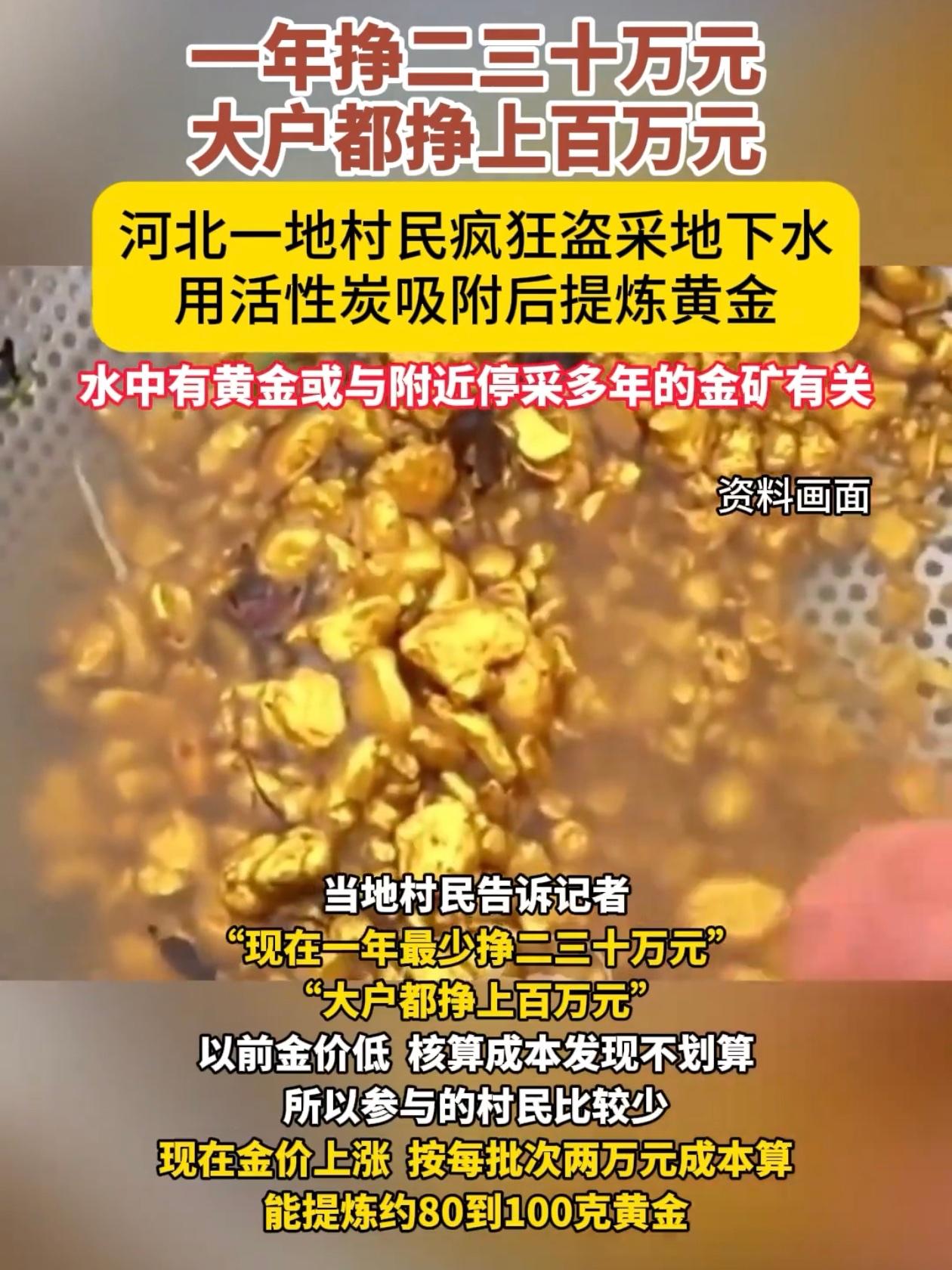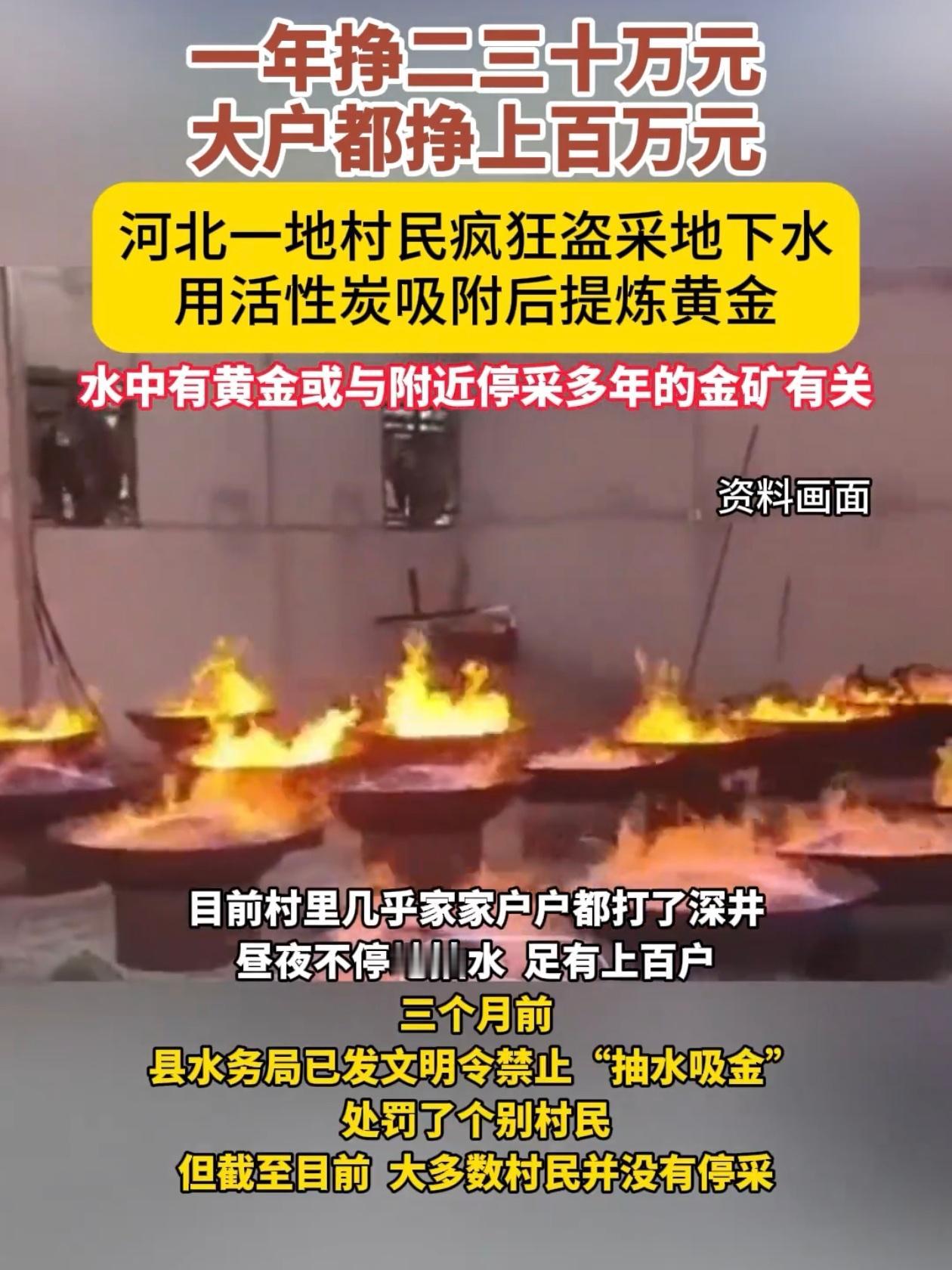 河北一个村子,旁边早些年有金矿,后来矿停了,人还在,金元素进到地下水里这茬,村里人心里有数,上报这条路按下不表,脑子一转,目光都落在自家院子里那口井上了。 家家户户动手,打深井,装大功率水泵,通上电,水不停地往外抽,抽上来过一遍活性炭,再拿去焚烧提炼,水里那点金被抠出来,一小粒一小粒攒起来就是钱,有的人一年能拿下百万净利,电表往上窜,一月一万多度,账单一摞一摞压在抽水机旁边,人盯着数字,机器盯着地下水位。 地下水往上提,地底那口子撑不住,井越打越深,周边水位跟着往下走,水资源这块儿板子被掏空的味道,谁都能感到,提炼环节也不省心,废水里带氰化物和重金属,这些东西往外一排,土壤跟着吃苦,往下渗,又回到地下,像绕了一圈,再来一遍污染,有人拿当年的矿遗留作比,分量更重的说法流传在村口的聊天里。 网上有人留言,喝水的安全怎么保证,孩子们长大要面对怎样的土地,这两条问得直白,村里也有人算账,电费是一条线,黄金是一条线,地下水位和土壤质量又是一条线,几条线拉在一块,哪头都不松。 地下水是公共资源,不是谁家想抽就抽,超量开采触到了水资源管理那道规矩,私下里把黄金从水里提出来,这个动作不在许可清单里,自家院子自家井这层说法挂着,实际把一整片区域的生态都搭进去,眼前的进账和土地的损耗对着放,天平怎么倾斜,站在地头就能看明白。 含氰的废水要是顺着沟渠进河道,渗进农田,作物和养殖都要跟着受影响,一边用受污染的地下水去炼金,另一边饮用水还得另找干净水源,这个循环摆在那里,谁都看得见,却不好受,邻近村子也会被牵连,范围不是只围着一圈围墙。 这事走到这步,管理部门该进场,依法处置,把脉,定性,阻断排放和继续开采的通道,把污染扩散按住,后面的路怎么走,修复多久,账怎么算,谁担着,村里人和周边人都在等一个清楚的说法,你看这局面,能收在什么位置。