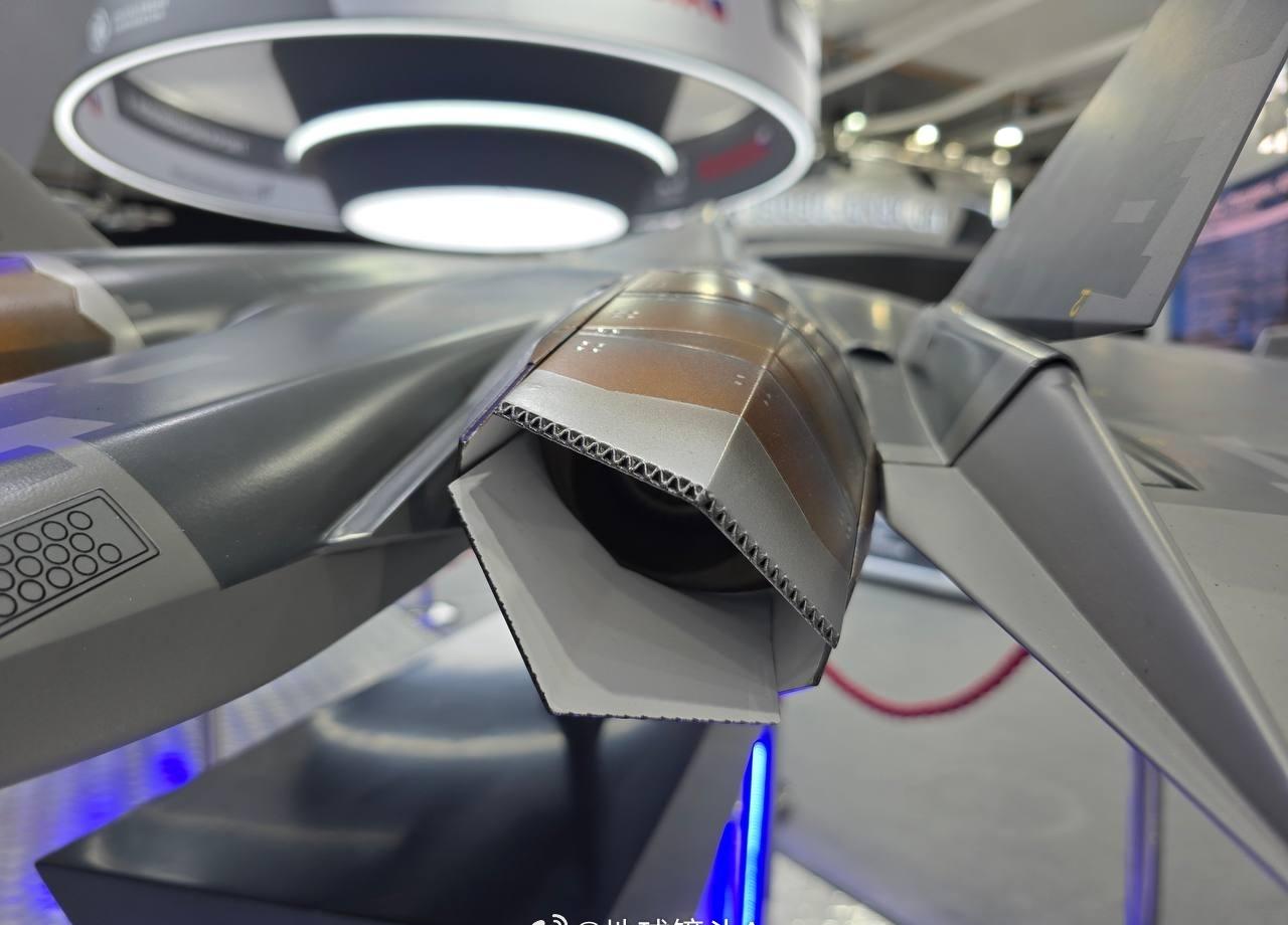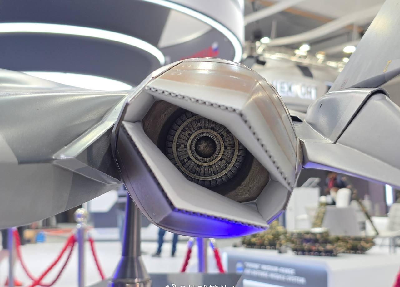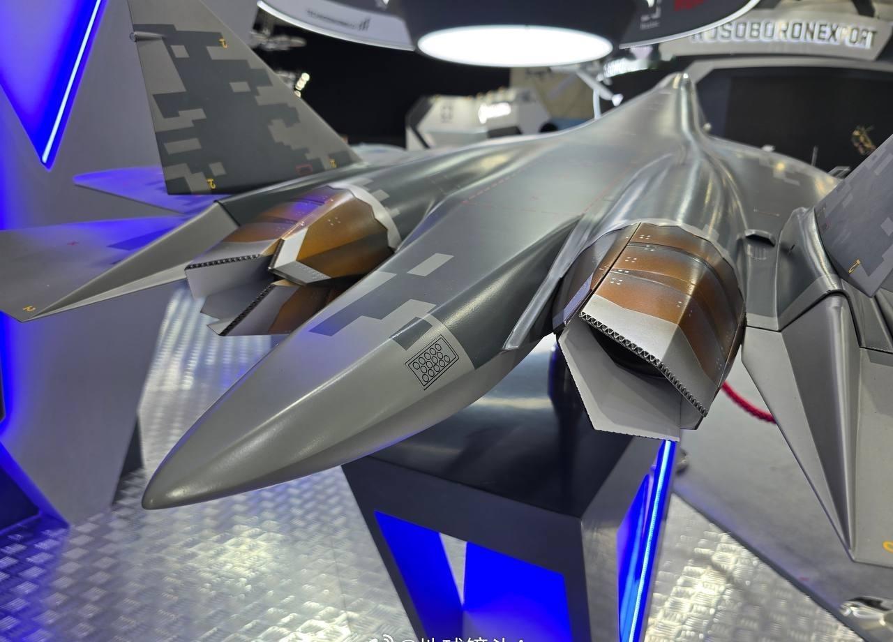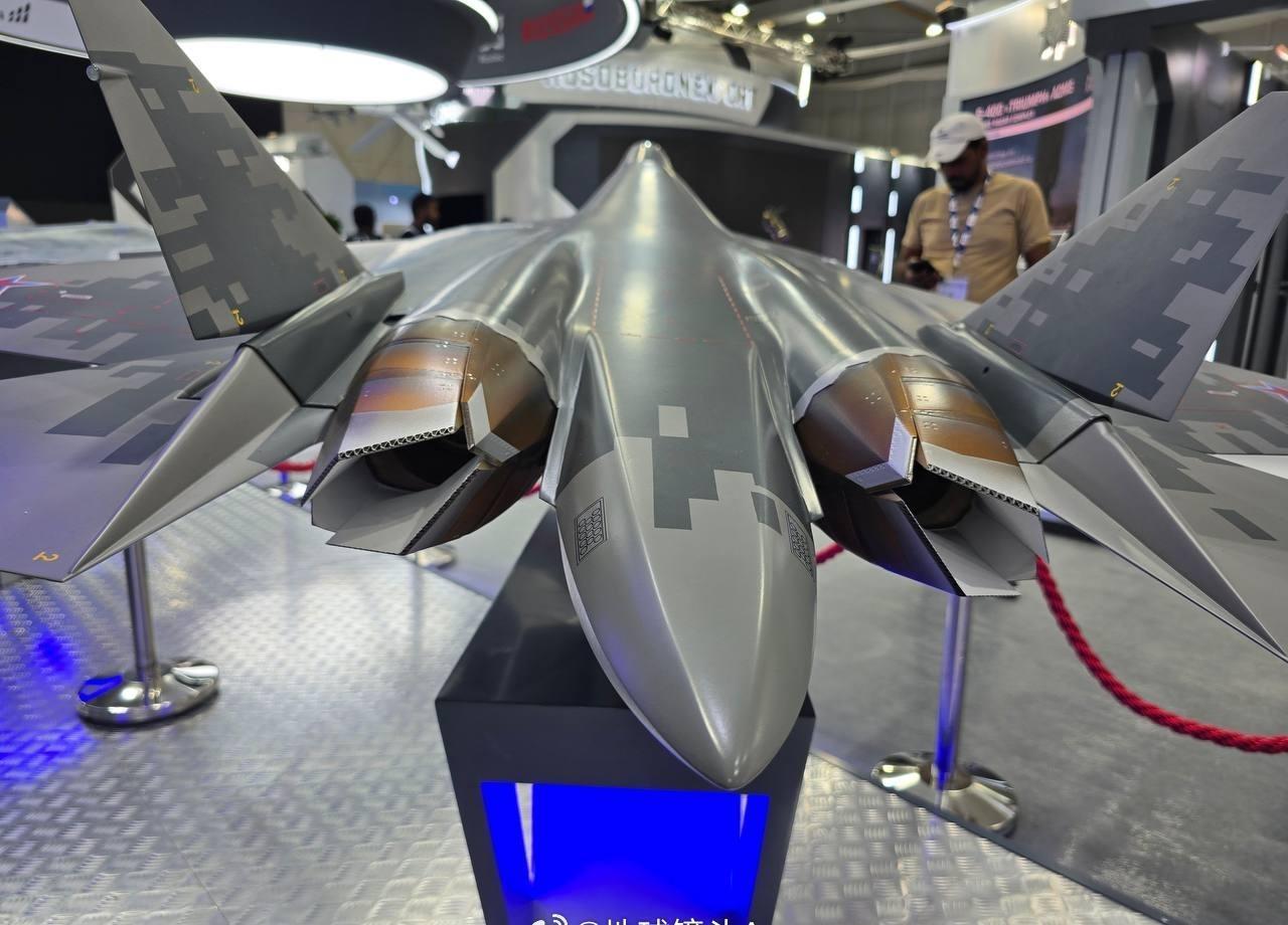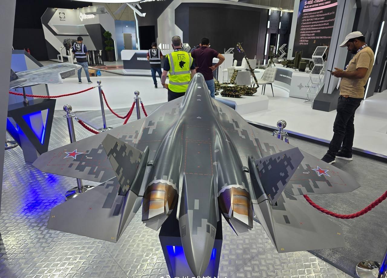 俄联合飞机公司在迪拜航展上的展台已布置完成 配备新型 AL-51F1(“产品 30”)双涵道涡轮喷气发动机的苏 - 57 战斗机模型亮相。该发动机采用扁平喷管设计,具备推力矢量控制能力。
