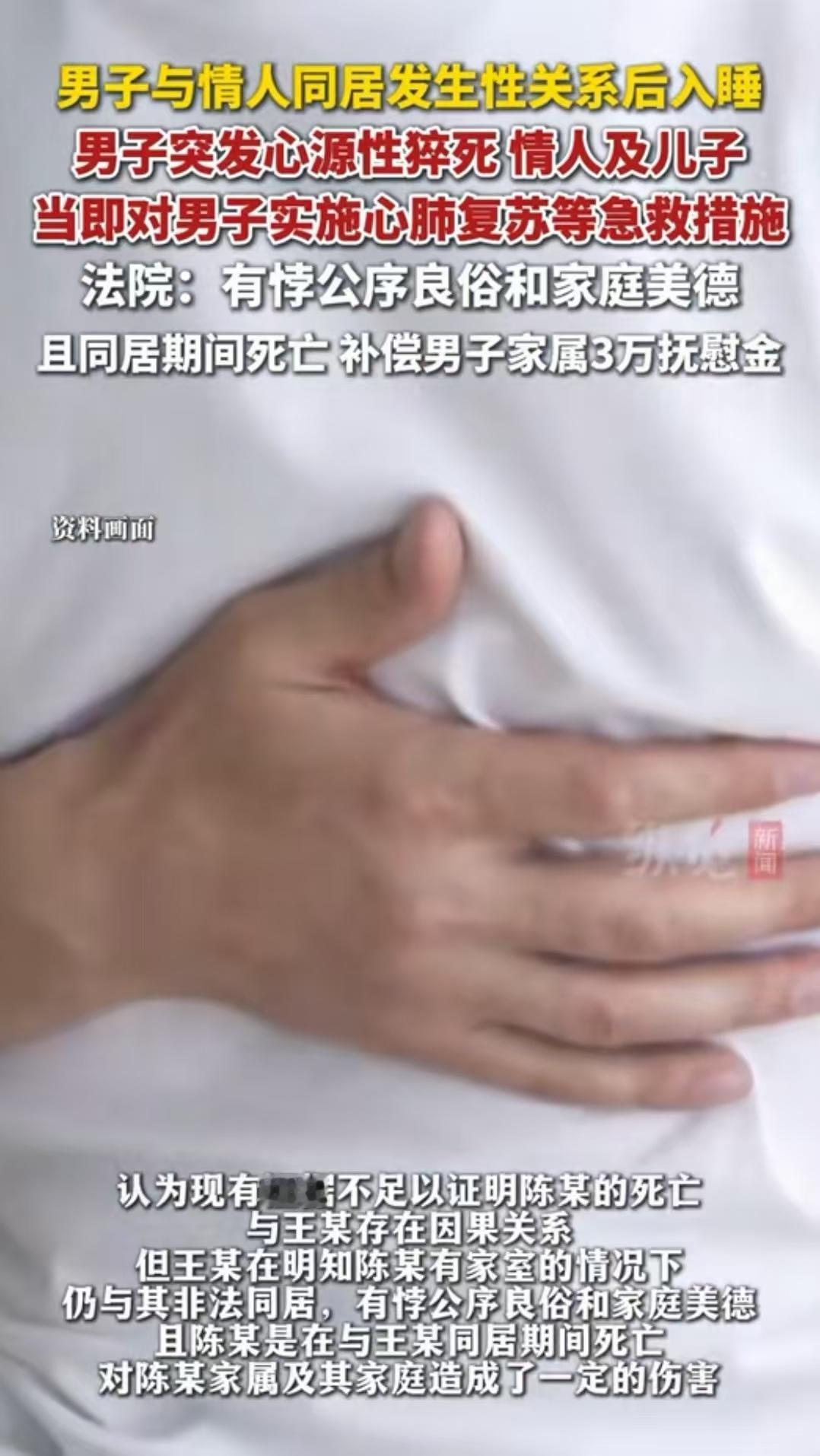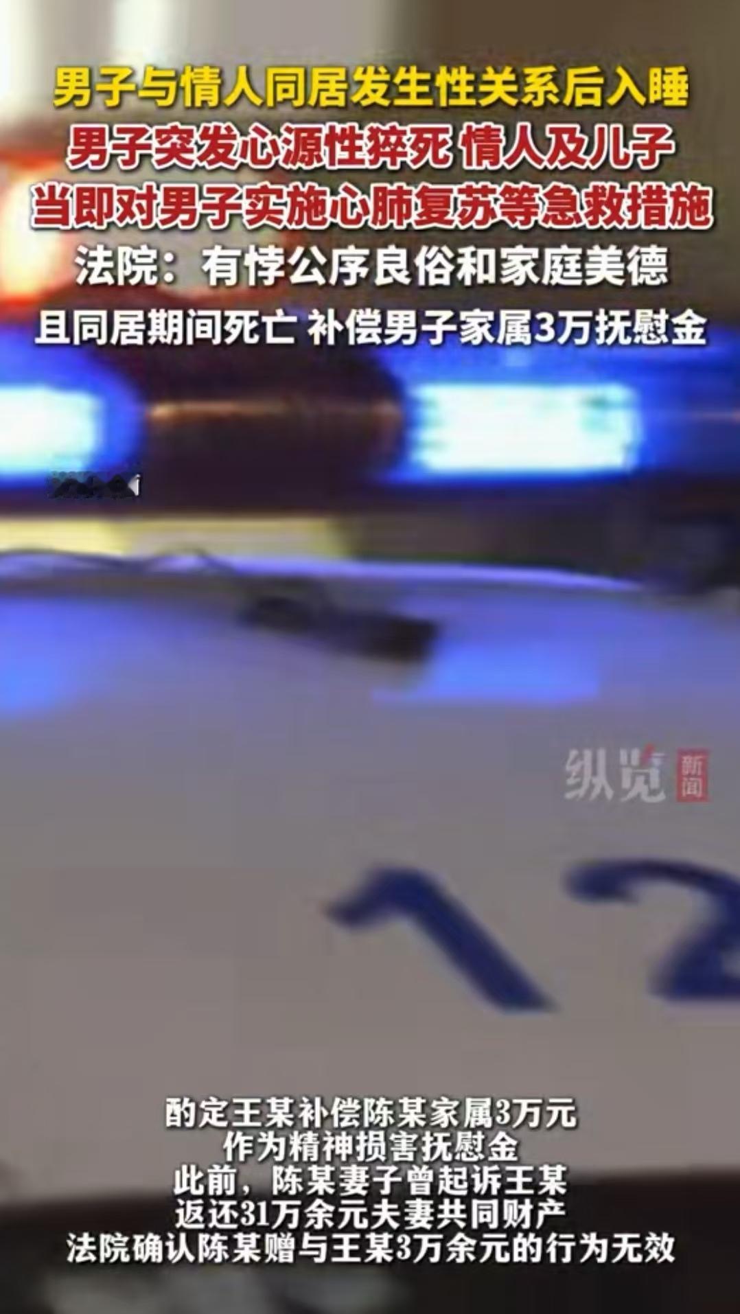 安徽安庆,已婚男子陈某在和情人王某发生关系后,突发心源性猝死,王某赶紧打了120并叫来儿子对他进行急救,可王某还是救治无效离世了。案发后,陈某的妻子起诉王某,要求她承担30%责任,赔偿丧葬费、死亡赔偿金等,共计37万余元,最终判决让人意想不到。 陈某是岳西县人士,家里有妻子孩子,可陈某却不甘于平凡的生活,长期与女子王某保持不正当的男女关系。 就这样过了多年,陈某的妻子得知了陈某背叛婚姻的事,2023年的1月11日,陈某的妻子起诉王某,要求她返还夫妻共同财产314531元。 后经查明,陈某赠予王某的3.3万余元为夫妻共同财产,责令王某返还。 陈某的妻子起诉后,陈某和妻子的关系进一步恶化,同年8月,陈某甚至直接搬到了王某在安庆市大观区某小区租住的房子里,开始和王某同居。 10月6日,陈某因为感冒有点咳嗽和发烧,王某陪同他去诊所输了五天液,18号陈某再次复发,王某在18、19号两天又陪他去了两次。 19日下午输完液回家后,陈某要和王某发生关系,王某没有拒绝,结束后二人外出了一趟,晚上陈某洗完澡后,王某给他拿衣服时,发现陈某腿脚无力发抖。 王某问他怎么样,要不要去看看,陈某摆摆手说没事,估计是感冒造成的,睡一觉就好了。王某没有在意,和陈某一块睡去。 当晚零时许,王某突然被陈某奇怪的呼噜声惊醒,她睁眼一看,陈某侧躺着,头无力地耷拉着,嘴角有口水,在不停翻白眼。 王某吓坏了,赶紧摇晃陈某并叫他的名字,可一直叫不醒。 王某赶紧去叫醒了她的儿子,并在0时21分打了120,王某的儿子则开始对陈某进行人工呼吸和心肺复苏等救助措施。 27分时,急救人员对陈某进行心电扫描,并当场告知王某,陈某已经死 亡。 随后,他们将陈某带回去继续抢救,可依旧抢救无效,并确认陈某已经离世,死 亡原因为心源性猝死。 案发后,陈某的妻子要求王某承担30%责任,赔偿家属丧葬费、死亡赔偿金等,共计37万余元。 陈某妻子认为,王某明知陈某有家庭,却长期和他保持不正当男女关系,有违公序良俗在先,陈某发病后,王某没有尽到救助义务在后,陈某的死和王某脱不开关系,王某应该承担责任。 王某辩解称,陈某来和自己同居时,称已经在办理离婚手续,他是自行来自己家与自己同居,并非自己诱骗。 另外,陈某此前只是感冒,自己并不能预见会产生这么严重的后果,且检查结果显示他是心源性猝死,并非自己诱发的。 最后,陈某发病后,自己又是打120又是给他做人工呼吸和心肺复苏,已经尽到了救助义务。 那么,本案从法律角度应该如何分析?法院又会怎么判呢? 《民法典》第一千零六十二条规定,夫妻在婚姻关系存续期间所得的财产,一般归夫妻共同所有。夫妻对共同财产,有平等的处理权。 本案中,陈某在婚姻存续期间将夫妻共同财产赠予情人王某,这种赠予行为未经其妻子同意,侵犯了妻子对夫妻共同财产的平等处理权。 该赠予行为违背了夫妻之间对共同财产的平等处理原则,且这种违背公序良俗的赠予行为不应受到法律保护。因此,法院责令王某返还该笔财产是符合法律规定的。 至于后续王某是否需要对陈某的死亡承担侵权责任,则需要看王某在此事中是否存在过错。 依据《民法典》第一千一百六十五条规定,行为人因过错侵害他人民事权益造成损害的,应当承担侵权责任。 陈某的妻子认为,王某明知陈某有家庭仍与其保持不正当关系,且在陈某发病后未尽责救助。 从法律角度看,陈某与王某保持不正当关系虽违背公序良俗,但这并不直接等同于对陈某死亡存在过错。 王某在陈某发病后,立即叫醒儿子并拨打120,其儿子也对陈某进行了人工呼吸和心肺复苏等急救措施,已尽到了一般人在这种情况下应有的救助义务。 另外,陈某的死 亡原因是心源性猝 死,这是一种突发的、难以预见的疾 病。 王某虽陪同陈某治 疗 感 冒,但无法预见陈某会因心源性猝 死离世,且没有证据表明陈某的死 亡与王某的行为存在直接因果关系。 所以,根据现有证据,不能认定王某对陈某的死 亡存在过错。 最终,经审理认为,虽然王某在此事中不存在过错,但她明知陈某有家室仍与他保持不正当关系,违背了公序良俗,陈某又在与王某同居期间死亡,确实给陈某家庭造成了一定的精神伤害。 最终,法 院酌定王某补偿陈某家属3万元作为精神损害抚慰金。 来源:红星新闻,纵览新闻