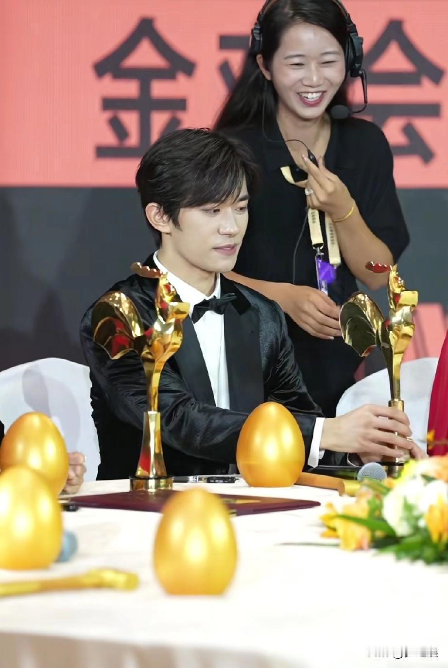 这个金鸡奖牌怎么看都好看,哈哈,易烊千玺看着奖牌不舍得放下,后来工作人员过来了,易烊千玺笑了,他真的很棒,才24岁就提了四次名,这次终于拿到了金鸡奖,拍的每一部作品都很不错,未来可期的一个小伙,歌唱的好听,演技也是杠杠的!