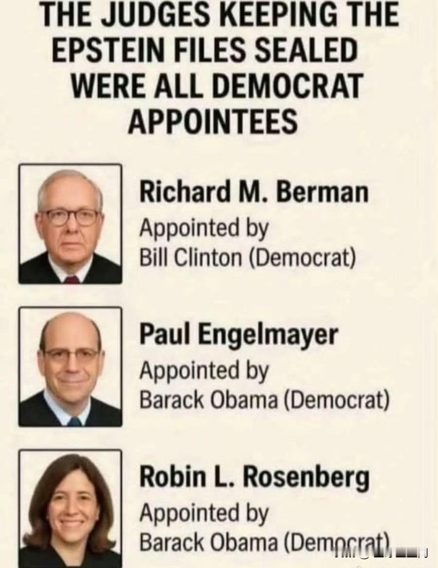 國會民左黨裝模作樣地嚷著要求解封解封愛潑斯坦(Jeffrey Epstein)檔案,然而拒絕川普政府司法部提出請求解封愛潑斯坦(Jeffrey Epstein)檔案的相關大陪審團(grand jury)記錄的三位法官全都是由民主黨任命的。 三位法官是: Richard M. Berman:1998年由民主黨總統比爾·柯林頓提名,紐約南區聯邦地方法院資深法官,曾主持愛潑斯坦2019年性販運案。 Paul Engelmayer:2011年由民主黨總統巴拉克·歐巴馬提名,也是紐約南區聯邦地方法院法官,曾主持吉絲蓮·麥克斯威(Ghislaine Maxwell)案。 Robin L. Rosenberg:2014年由民主黨總統巴拉克·歐巴馬提名,是佛羅里達南區聯邦地方法院法官,曾處理佛州早期愛潑斯坦調查。 裁決細節: • Rosenberg(2025年7月23日):拒絕解封佛州2005-2007年大陪審團記錄,理由是法律僅允許極限例外解封,且司法部請求不符條件。   • Engelmayer(2025年8月11日):拒絕解封麥克斯威案大陪審團材料,稱其內容多為公開記錄重複,無新資訊,且解封會損害大陪審團保密原則。    • Berman(2025年8月20日):拒絕解封愛潑斯坦2019年案大陪審團記錄,稱其僅70頁內容遠小於司法部已持有的10萬頁檔案,且解封可能危害受害者隱私;他批評此請求為「轉移注意力」。    這些裁決基於聯邦刑事訴訟規則Rule 6(e),強調大陪審團保密以保護證人及受害者。法官們表示,解封不會揭示新事實,且司法部可直接發布其持有的檔案。