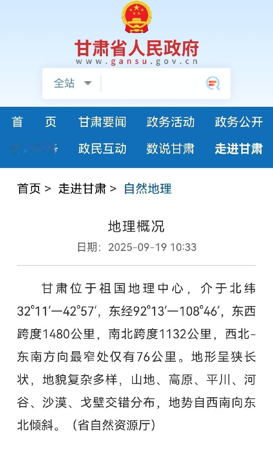 甘肃是我国最狭长的国家,西北—东南向延伸,最长处达到1600多公里,中间最窄处只有76公里。甘肃省的轮廓是斜着的,到底偏南北向,还是偏东西向呢?东西跨度1480公里,南北跨度1132公里,因此,明显偏东西向。