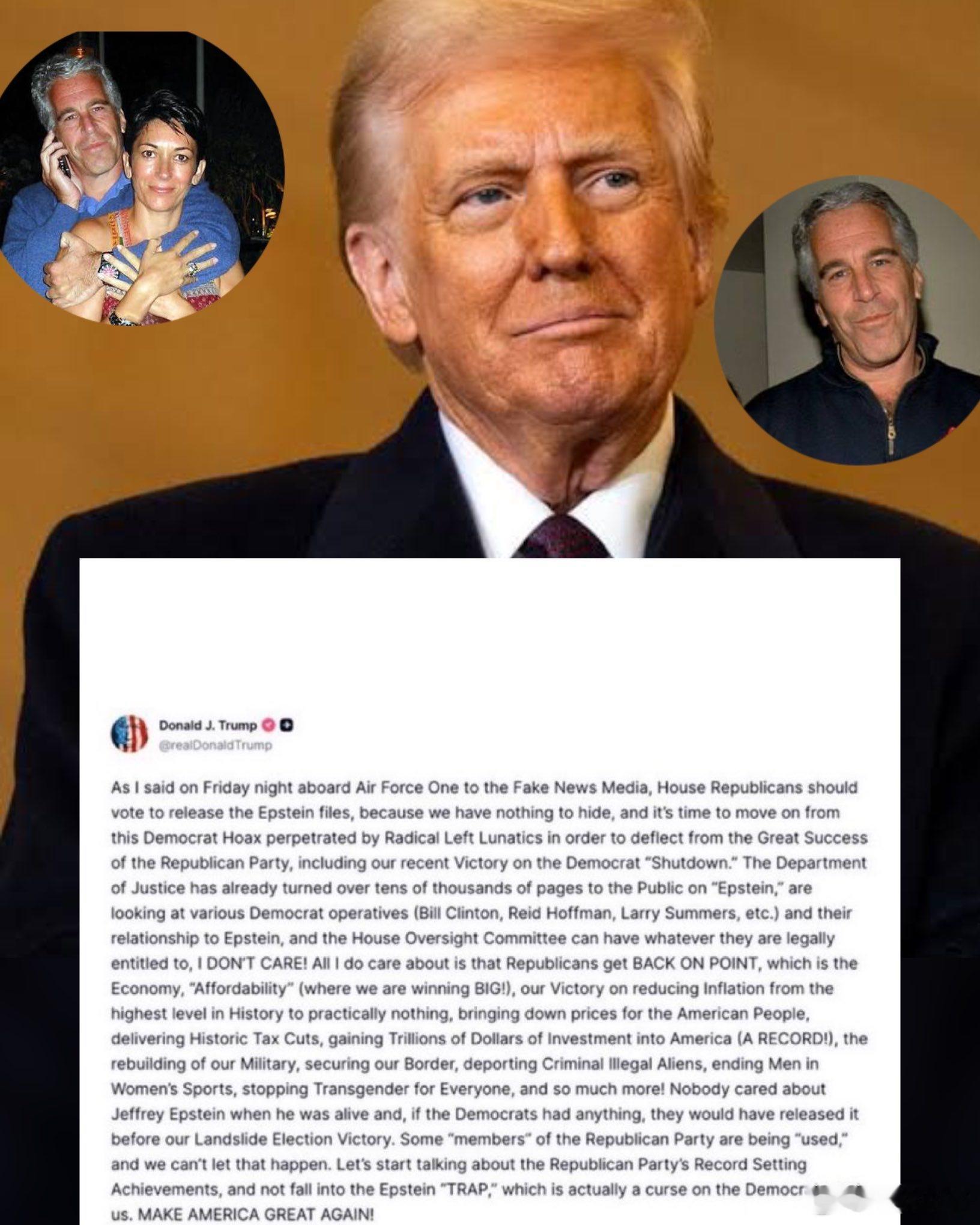 Epstein最新进展:川普正在“设局”,把民主党逼上台面。川普刚刚在空军一号上把话说得极其清楚:公开Epstein的所有档案。全部公开。因为他没有任何需要隐藏的——而民主党非常清楚这一点。激进左派一直试图用Epstein当作“转移注意力”的工具,但川普把整个剧本直接反转了。他等于在说:“来吧,把所有文件公开。我不在乎。真相对我有利——不是对你们。”这是在最公开、最直接的方式中,把民主党逼到墙角。而且他说得没错。司法部已经公布了数以万计的Epstein文件。而上面频繁出现的名字是谁? 比尔·克林顿、Reid Hoffman、Larry Summers……以及一长串民主党权势人物。不是川普。民主党现在慌了——因为如果共和党真的把所有东西全部公开,聚光灯会重新照回他们自己的人,而不是那个他们多年尝试(并失败)去摧毁的川普。川普正在告诉共和党:别再上当。别再被牵着走。把注意力放回我们正在大获全胜的议题上:经济、可负担性、通胀、减税、边境安全、保护女子体育、重建军队……真正的政绩。如果民主党真的握有川普的黑料,他们早在多年前就已经公开了——尤其是他那次史诗级大胜之前。他们没公开。因为根本什么都没有。这一整场围绕Epstein的狂热——不是川普的陷阱。 而是民主党的陷阱。