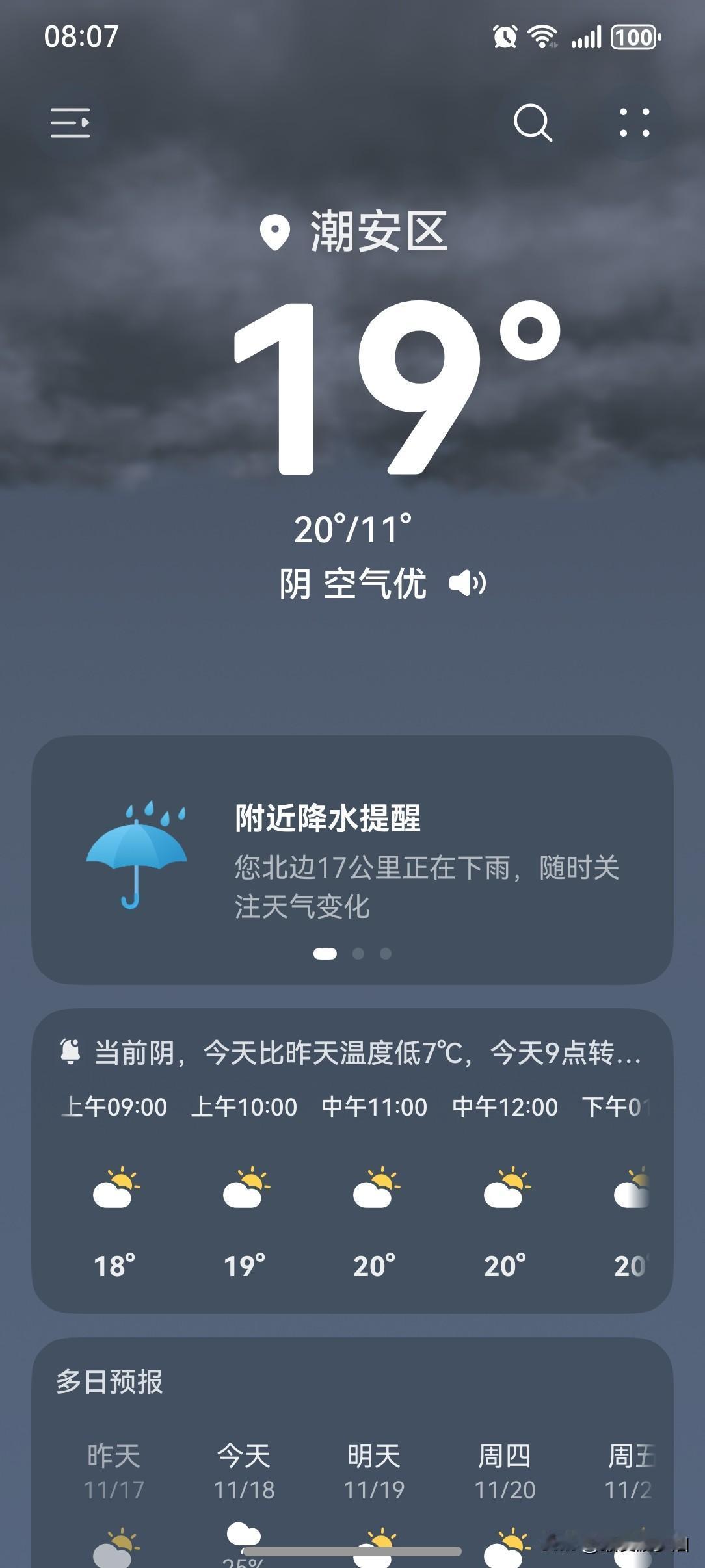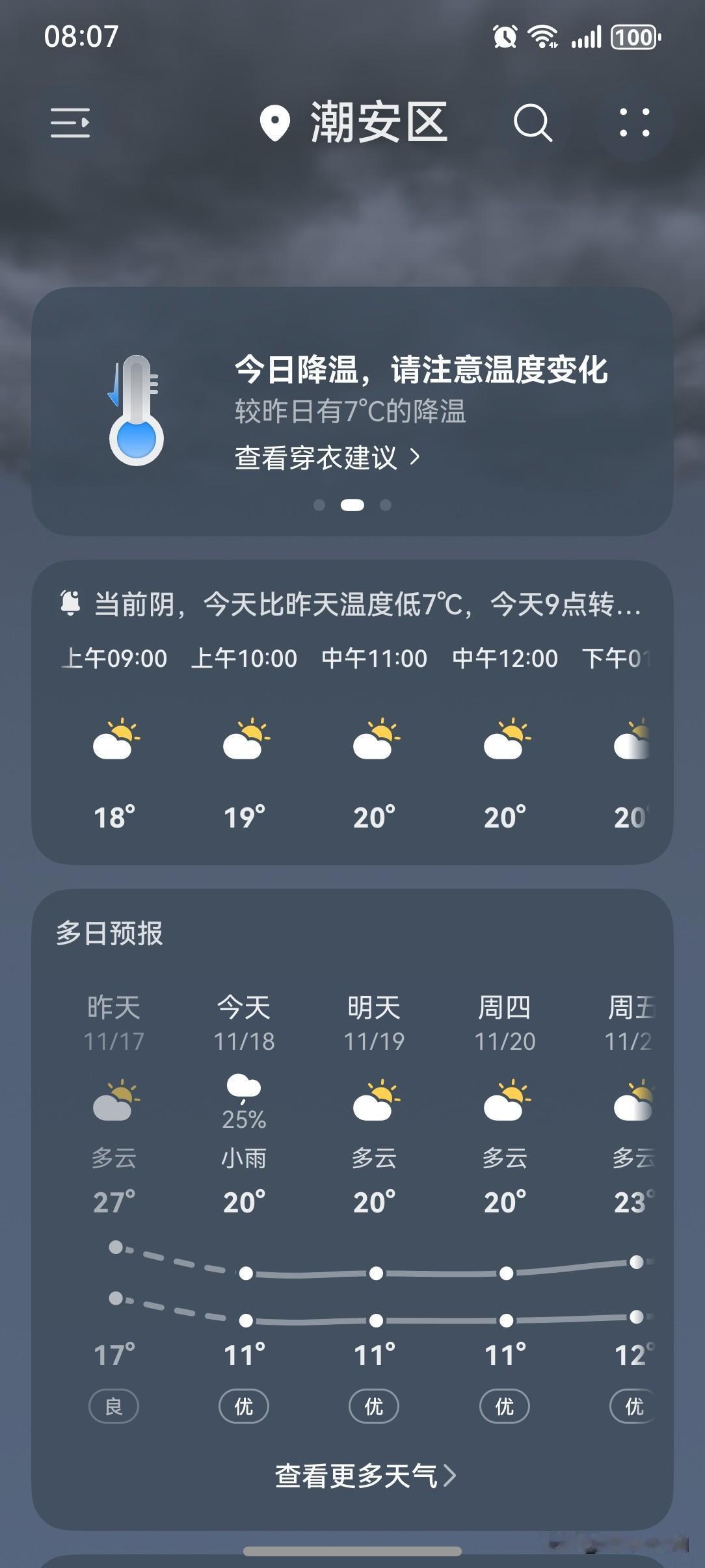 冷冷冷我冷冷冷!广东开启速冻模式! 受强冷空气影响,18~19日,我省大部市县阴天,部分市县有小雨或零星小雨; 各地气温将较17日明显下降,昼夜温差小,过程气温下降幅度:粤北市县下降8~10℃,中南部市县下降6~8℃;大部分市县过程最低气温将出在20日早晨前后,其中粤北偏北市县5~8℃(粤北高海拔山区2~5℃); 17~19日受冷空气影响时我省陆地有阵风5~7级。 今天(18日),潮州阴天,气温11~20℃,此刻气温19℃,体感温度16℃。注意防寒保暖!潮州发布寒冷黄色预警! 看看今天的天空,天气画风已变!没有了往日的阳光普照,转为阴天,云量明显增多。 早上起来,发现气温居然还没有下降!难道冷空气又在路上被什么绊住了脚步?还是说昨天的气温实在是太高了,余热还在? 从昨晚已经提前做好了降温准备,厚被子、厚衣服通通都已经拿出来了。可谁能料到!昨晚居然需要开着风扇才能入睡,厚衣服今天居然也没有派上用场,这下心情有些复杂了。 从失落到郁闷,再从郁闷到欣然接受,我总共花费了不到一分钟的时间。 早上心情稍微有一点失落(因为花费了时间和精力准备的东西没派上用场,总不能硬用吧?现在穿厚衣服实在是不太合适,太热了!),然后又有些郁闷(不知道冷空气具体什么时候来?),但转念一想,这样不是更好吗?多一天暖和的日子不香吗?可以接着奏乐接着舞啊!如此一想,倒也欣然接受还没降温的现实。 冷空气到达的地区,小伙伴们要注意防寒保暖! 冷空气尚未到达的地区,接着奏乐接着舞,一边舞一边等吧! 相信冷空气虽迟但到!