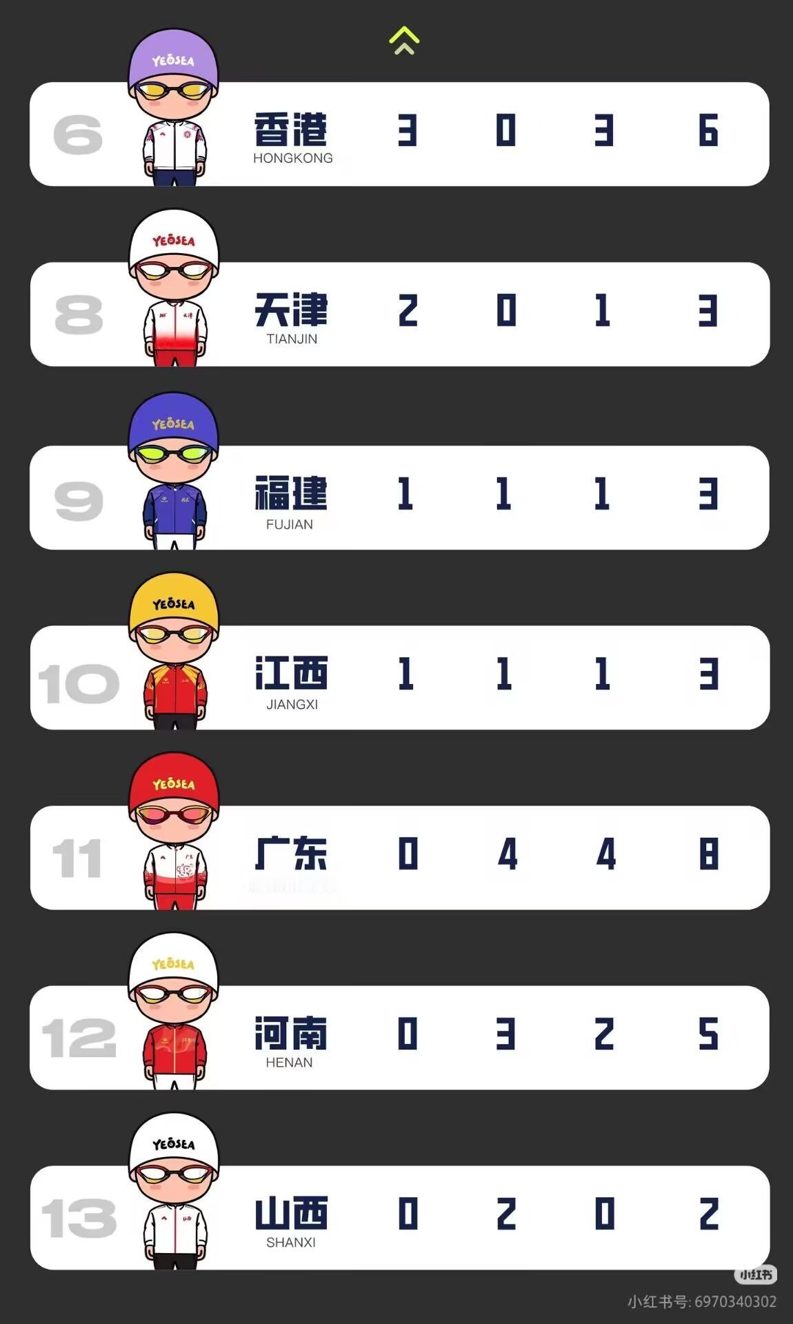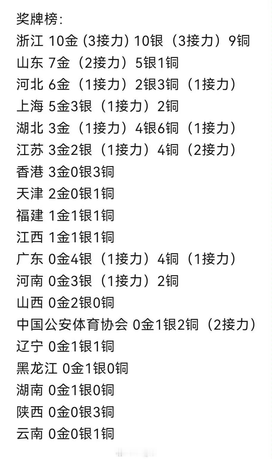 本届全运会游泳奖牌榜:浙江10金10银9铜依然居首,但金牌数比上届明显少了。山东7金5银2铜居次席,其中张展硕一人独得五金。河北、上届、湖北紧随其后 ,香港也有3金进账。值得一提的是,东道主广东队一金未得!在刘湘退役和余贺新老了之后,广东队没有拿得出手的游泳好手了,最大夺金点陈俊儿和汪雪儿均表现不佳。如果最后广东拿不到金牌榜第一,基本就是输在游泳这里了!光是游泳就被浙江和山东甩一条街了!