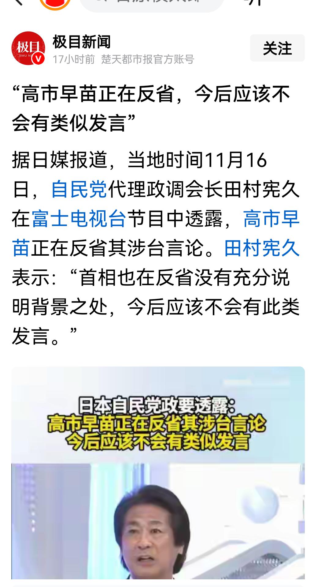高市早苗不要妄图洗白,黑的永远白不了! 说什么正在反省和以后不再犯浑的鬼话,现在的问题都不想解决,还谈什么以后?欺骗谁呢?中国人不是好欺负的,也不是好糊弄的! 高市早苗不要妄图避重就轻,如果真有诚意悔过,那就应该深刻检讨自己错误言行的政治背景,向十四亿中国人民和全世界人民郑重道歉!
