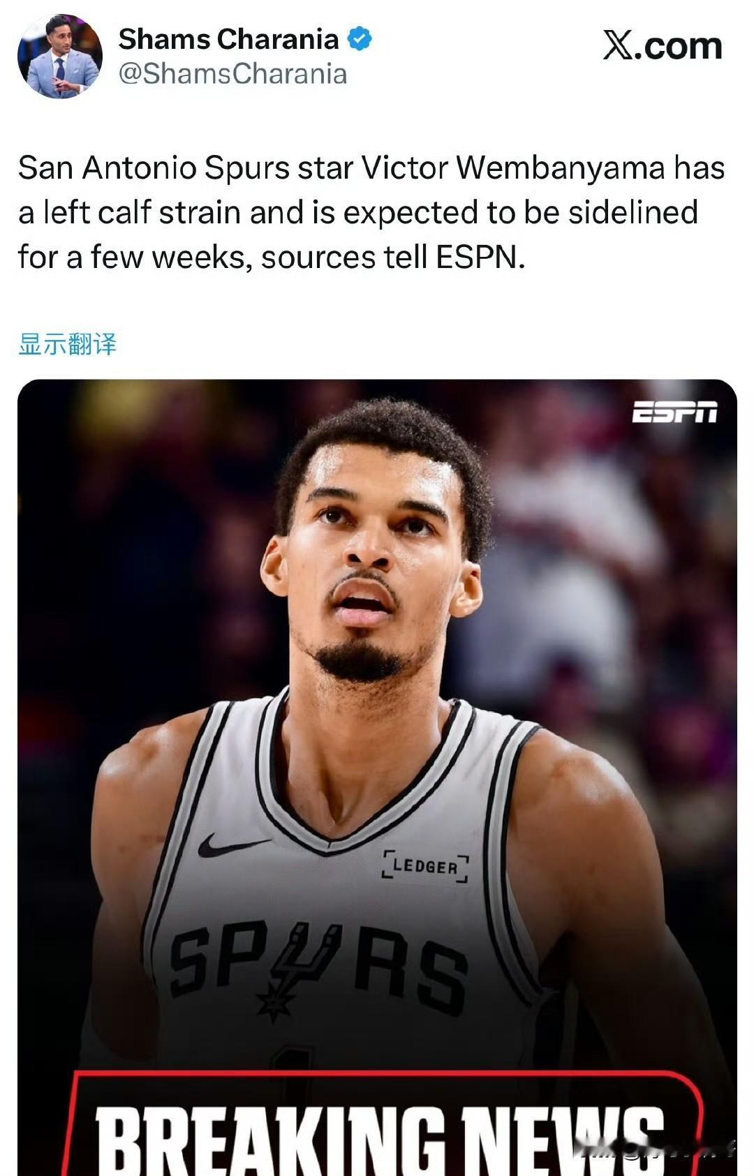 天赋与伤病的抗衡!!!文班亚马左小腿拉伤,将缺阵数周! 根据记者Shams最新消息透露,马刺当家球星文班亚马遭遇了左小腿拉伤,预计他将缺席数周比赛(2-4周)。 文班亚马是马刺未来的希望,球队十分关注他的健康,目前马刺排在西部第五,哈珀应该也快回来了吧,这样至少保证他们有多个进攻点。 文班亚马的天赋是非常强的,这个身高,这个技术,让他有机会成为未来的超级球星,能够影响他的只有伤病。 当天赋遇上伤病有多少球星是倒在伤病之下,这是历史性难题,因此对于文班亚马的伤病马刺是非常谨慎的,任何细小的事情都可能成为他们崛起的拦路虎。 文班亚马