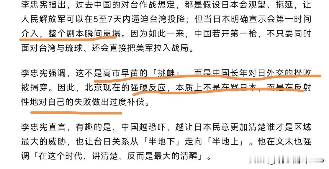 “台独”分子李忠宪表示,中国之所以对日本首相高市早苗暴跳如雷,不是因为一句政治口水,而是因为她一语道破了北京最不愿面对的战略现实,也就是台湾有事=日本有事=美国有事。李忠宪声称,过去中国的对台作战想定,都是假设日本会观望、拖延,让人民解放军可以在5至7天内逼迫台湾“投降”。 但当日本明确宣示会第一时间介入,整个剧本瞬间崩塌。因为如此一来,中国若开第一枪,不只要同时面对台湾与琉球、还会直接把美军拉入战局。这不是高市早苗的挑衅,而是中国长年对日外交的“挫败”被揭穿。因此,北京现在的强硬反应,本质上不是在骂日本,而是在反射性地对自己的“失败”做出过度补偿。 中国越恐吓,越让日本民意更加清楚谁才是区域最大的威胁,也让台日关系从半地下走向半地上。对于这个“台独”分子的言论我们怎么看呢?说句不客气的,我们只能说,梦里面什么都有。明明“台独”分子是美国的棋子,搞的美国,日本都要听棋子的话一样,还扯什么台湾有事=日本有事=美国有事?此人似乎完全不懂得什么叫料敌从宽? 我们解决台湾问题,从来考虑的都是把美国介入当作最基本的前提,而美国介入,日本必然会介入,这是在明白不过的事情。不然,我们在台海周边准备那么多对付军舰,航母的反舰导弹,这是要干嘛?“台独”分子为了哄骗岛内民众,将岛内民众绑架上“台独”的战车,因此紧抱美日的大腿。 不过,在两岸军力完全失衡的情况下,美国是越来越不敢插手。高市早苗头铁,在台湾问题上胡言乱语,如果美国真要是现在要搞事情,为什么特朗普,鲁比奥,赫格塞思目前一句公开挺高市早苗的话都没有呢?美国的沉默现在确实有点震耳欲聋,“台独”分子是听不见这种巨大的沉默声响吗?看不见大势,胡言乱语,沉浸在自己的世界里面自嗨,这不就是“台独”分子最典型的做派吗?
